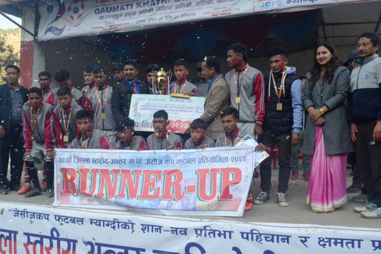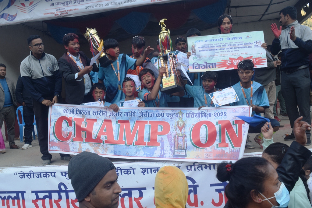 म्याग्दी २४ मंसिर । सदरमुकाम बेनीमा शनिवार सम्पन्न २० औँ अन्तरमावि जेसीज कप फुटवल प्रतियोगिताको उपाधि शारदा मावि छिस्बाङले हात पारेको छ । फाइनलमा बेनीको प्रकाश माविलाई १ का विरुद्ध २ गोल गर्दै मंगला गाउँपालिका–५ छिस्वाङमा रहेको शारदा माविले पहिलो पटक जेसीज कपको उपाधी जितेको हो ।