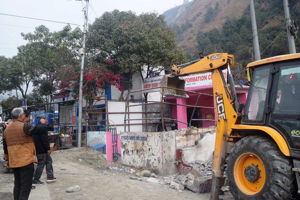 म्याग्दी १६ पुस । बेनी नगरपालिकाले सार्वजनिक जग्गामा निर्माण भएका अव्यवस्थित भौतिक संरचना हटाउन सुरु गरेको छ । नगरलाई ब्यवस्थित बनाउन सार्वजनिक जग्गामा निर्माण गरिएका संरचनालाई हटाउन सुरु गरेको हो । शुक्रवार नगरले वडानम्वर ८ मा पर्ने कालीपुलको बसपार्कमा रहेका अव्यवस्थित संरचना हटाइएको हो । नगरपालिकासंग सार्वजनिक जग्गा भाडामा लिएर बसेकाहरुले सम्झौताको म्याद सकिएको र नगरपालिकाले पटक पटक ताकेता गर्दा समेत अटेर गरेपछि नगरपालिकाले डोजर लिएर अव्यवस्थित संरचना हटाउन सुरु गरेको जनाएको छ । शुक्रवारसम्म कालीपुल बसपार्क निर्माणस्थलमा ड पर्ने यातायात कम्पनीको दुई वटा टिकट काउन्टर, क्लबको भवन, सार्वजनिक शौचालय लगायतका अव्यवस्थित संरचना डोजर लगाएर हटाएको हो ।