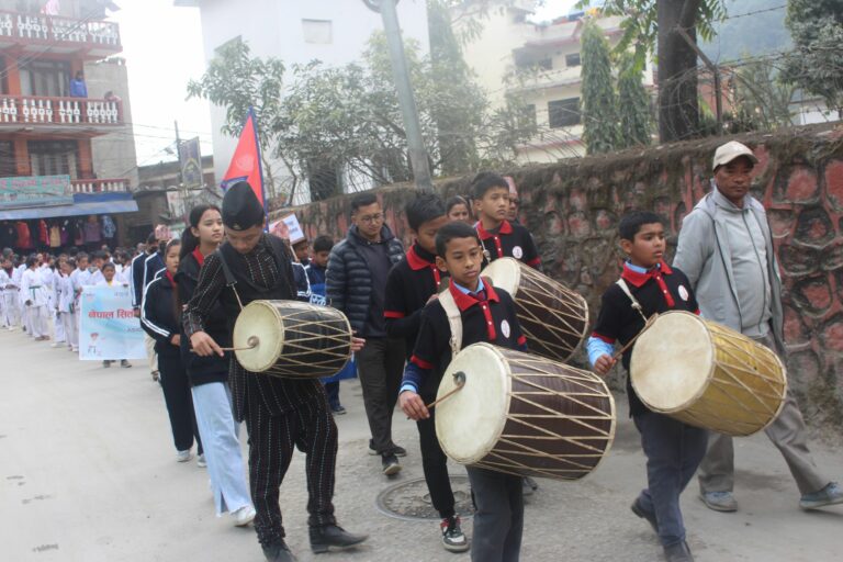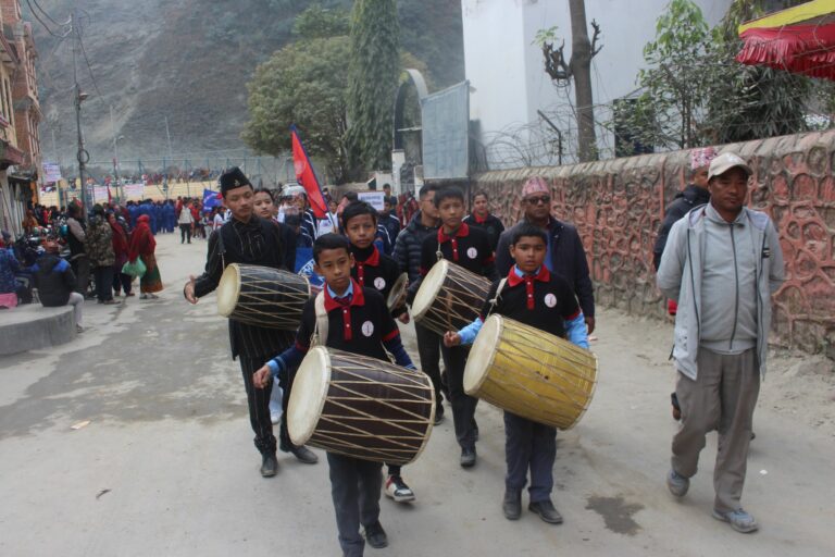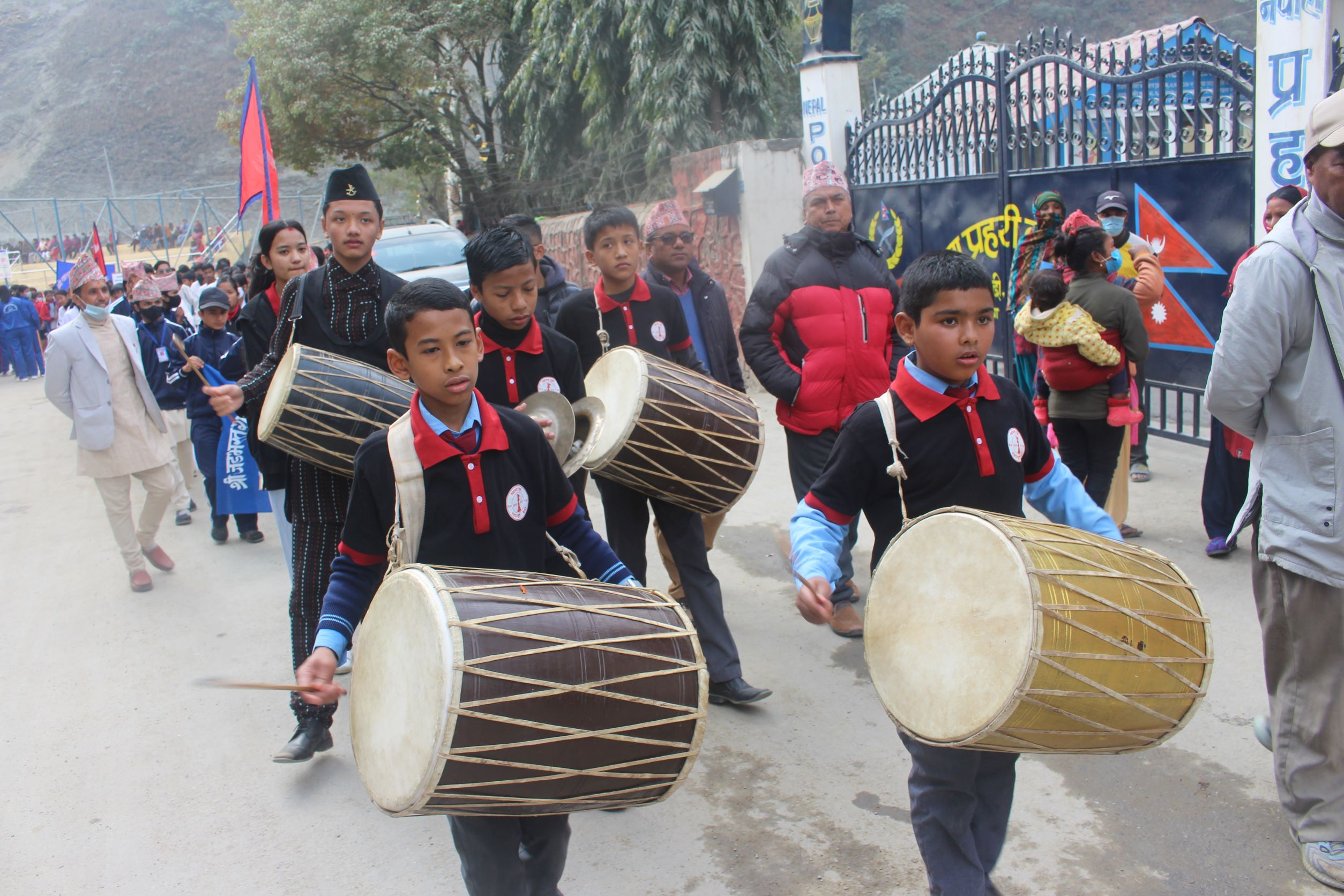 म्याग्दी, १७ पुस । बेनी नगरपालिकाको आयोजनामा सदरमुकाम बेनीमा संचालित विद्यालयस्तरको राष्ट्रपति रनिङ्गशिल्ड प्रतियोगिताको बजार¥यालीमा सहभागी नेवार समुदायको धिमे बाजा बजाउदै बालबालिका । तस्विर ः धीरन खत्री