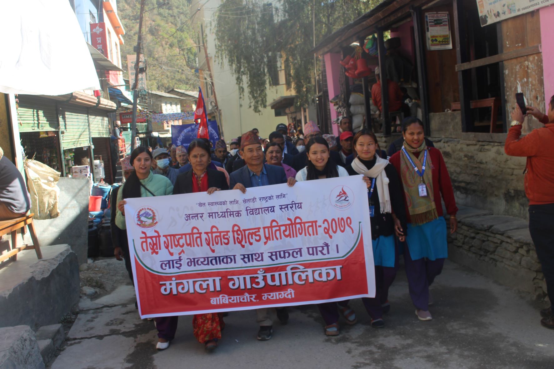 म्याग्दी, १३ माघ । मंगला गाउँपालिकाको आयोजनामा तेस्रो विद्यालय स्तरीय राष्ट्रपति रनिङ शिल्ड खेलकुद प्रतियोगिता शुरु भएको छ । रनबाङस्थित खेलमैदान सूरु भएको प्रतियोगिताको उद्घाटन जिल्ला समन्वय समितिका प्रमुख राजकुमार थापाले गर्नुभएको थियो । माघ १५ गतेसम्म संचालन हुने प्रतियोगितामा १० वटा माध्यमिक विद्यालयको सहभागिता रहेको छ ।