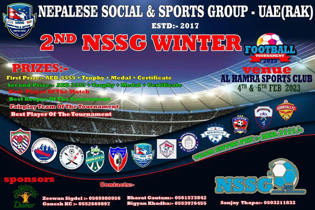यूएई, १७ माघ । युएईको रसअल खेमामा रहेको नेपाली सामाजिक तथा खेलकुद ग्रुपले आगामी माघ २१ र २२ गते( फेव्रोवरी ४÷ ५ तारिक ) हुने दोस्रो एन.एस.एस.जि. विन्टर फूटबल प्रतियोगिताको तयारी पुरा भएको जानकारी गराएको छ । यूएईको रस–अल–खेमा स्थित अल हमरा खेलमैदानमा हुने प्रतियोगितामा नेपाली १६ टिमको सहभागिता हुनेछ ।