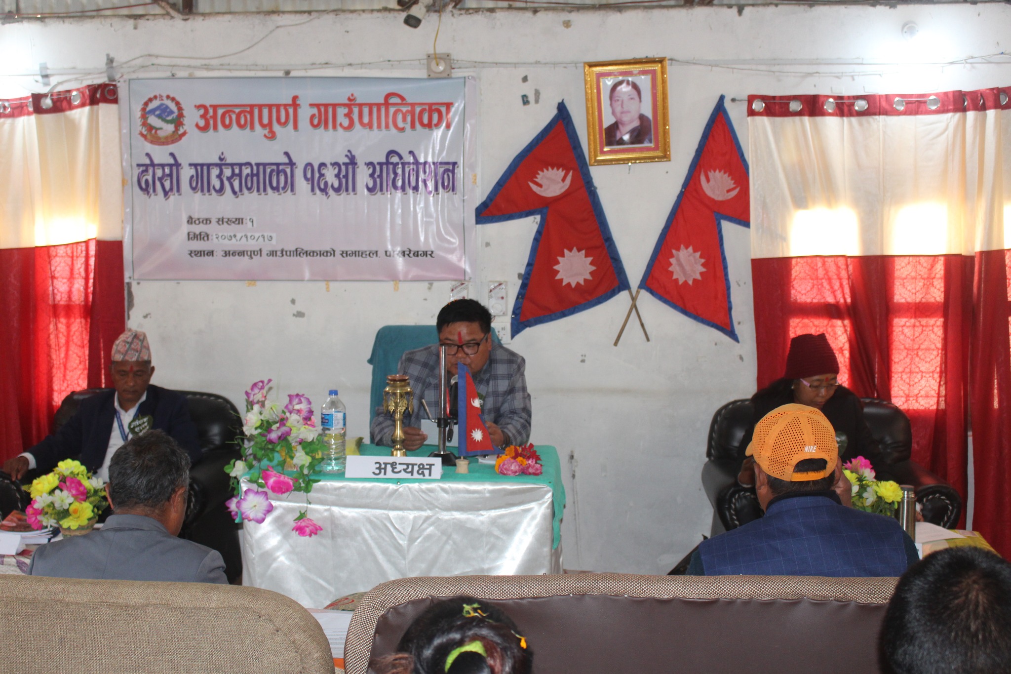 म्याग्दी, १८ माघ । म्याग्दीको अन्नपूर्ण गाउँपालिकाको १६ औं गाउँसभा मंगलबार पोखरेबगरमा शुरु भएको छ । सभामा चालु आर्थिक वर्षका लागि थप रु दुई करोडको संसोधित बजेट प्रस्ताव, एक वटा विधेयक टेवुल र आवधिक, राजस्व सुधार र लैससास योजना प्रस्तुत गरिएको छ । चालु आर्थिक वर्षको अर्धवार्षिक प्रगति प्रतिवेदन प्रस्तुत भएको सभामा आर्थिक वर्ष २०७७्७८ को अन्तिम लेखा परिक्षण प्रतिवेदन छलफलका लागि प्रस्तुत र लेखा समिति गठनको प्रक्रीया शुरु भएको छ ।