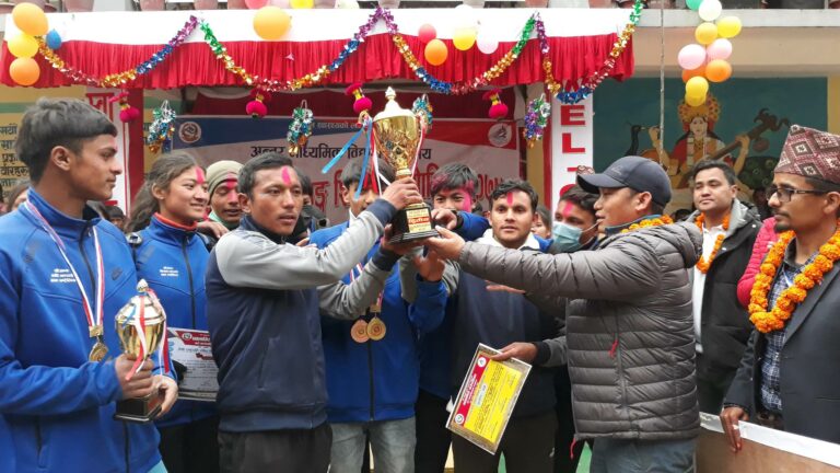 म्याग्दी, २२ माघ । धवलागिरी गाउँपालिकाले आयोजना गरेको तेस्रो राष्ट्रपति रनिङ शिल्ड खेलकुद प्रतियोगिताको उपाधी हेम नमुना आवसीय मावि शिवाङले जितेको छ ।