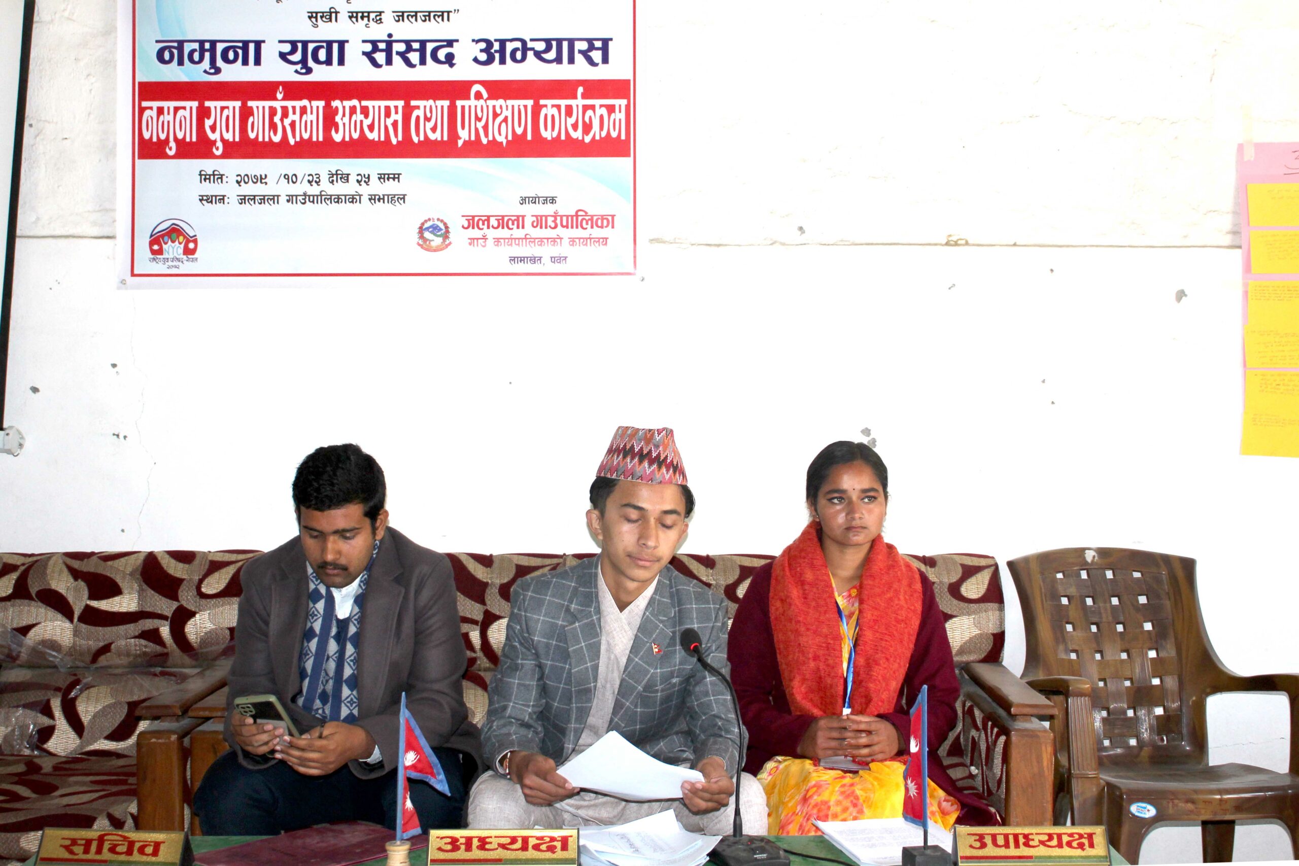 जलजला, २६ माघ । पर्वतको जलजला गाउँपालिकाको केन्द्र लामाखेतमा नमुना युवा गाउँसभा अभ्यास तथा प्रशिक्षण कार्यक्रम गरिएको छ । राष्ट्रिय युवा परिषद्को प्राविधिक सहयोगमा जलजला गाउँपालिकाले युवाहरुलाई नीति निर्माण गर्ने ठाउँ गाउँ, प्रदेश र प्रतिनिधीसभा सञ्चालनको प्रक्रीयाको बारेमा सैद्धान्तिक तथा व्यवहारिक ज्ञान सिप प्रदान गर्ने उद्देश्यले कार्यक्रम आयोजना गरेको हो ।