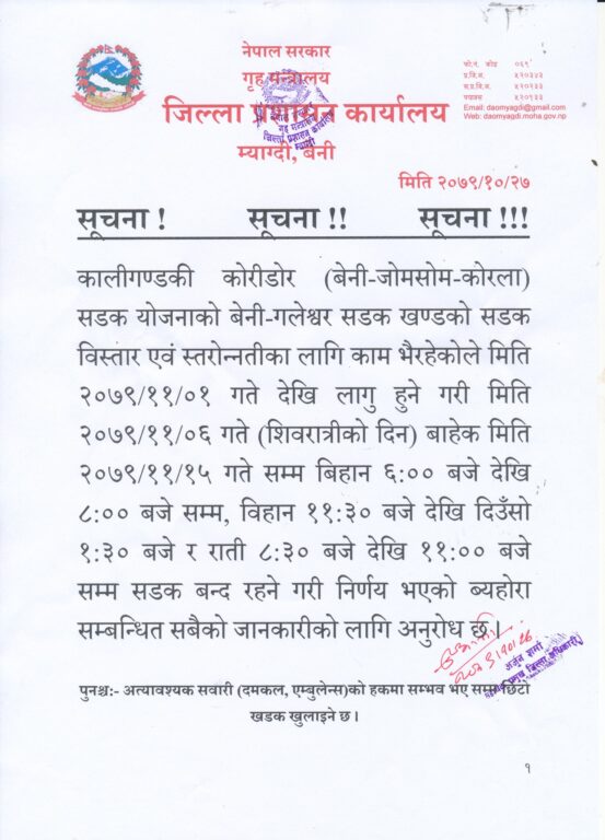 प्रमुख जिल्ला अधिकारी तुलसीराम पौडेलको अध्यक्षतामा बेनी नगरपालिकाका प्रमुख सुरत केसी, बेनी–जोमसोम¬– कोरला सडक आयोजना, निर्माण कम्पनी, यातायात व्यवसायी र सुरक्षा निकायका प्रतिनिधिको बैठकले समय तालिका बनाएको हो । सहायक प्रमुख जिल्ला अधिकारी अर्जुन शर्माले फागुन १ देखि १५ गतेसम्म बिहान ६–८, दिउँसो ११ः३० देखि १ः३० र राती ८ः३० देखि ११ बजेसम्म सडक स्तरोन्नतिका लागि यातायात आवत जावत बन्द गरिने जानकारी दिनुभयो । एम्बुलेन्स लगायत अत्यावश्यक सवारी साधनलाई सहज आवत जावत र साना सवारी डल्लेपिपल–राहुवडा–गलेश्वर वैकल्पिक मार्गको व्यवस्था मिलाउने निर्णय पनि गरिएको छ ।