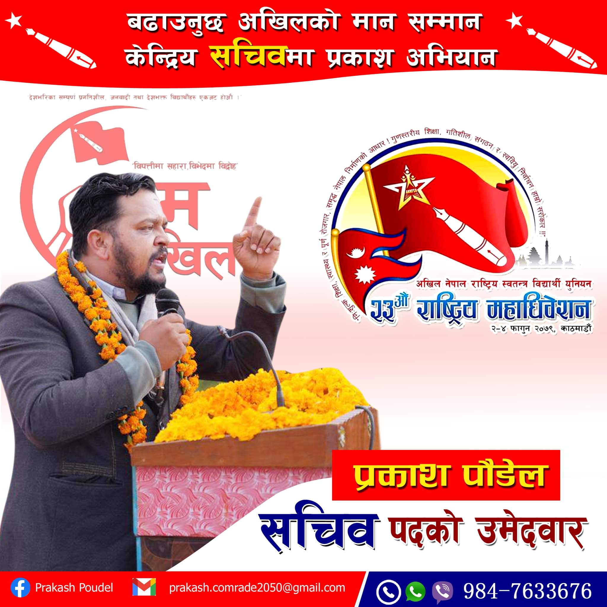 अनेरास्ववियु गण्डकी प्रदेशका अध्यक्ष समेत रहेका पौडेलले सङ्गठनलाई चलायमान र गतिशील बनाउन फागुन २ देखि ४ गतेसम्म काठमाडौंमा हुने २३ औँ महाधिवेशनमा सचिव पदमा उम्मेदवारी दिने घोषणा गर्नुभएको हो ।