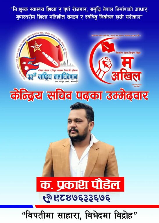 म्याग्दी, २७ माघ । म्याग्दीबाट विद्यार्थीको नेताको रुपमा उदाएका प्रकाश पौडेलले एमाले निकट विद्यार्थी सङ्गठन अखिल नेपाल राष्ट्रिय विद्यार्थी युनियन (अनेरास्ववियु) को केन्द्रिय सचिव पदमा उम्मेदवारी दिने भएका छन् ।