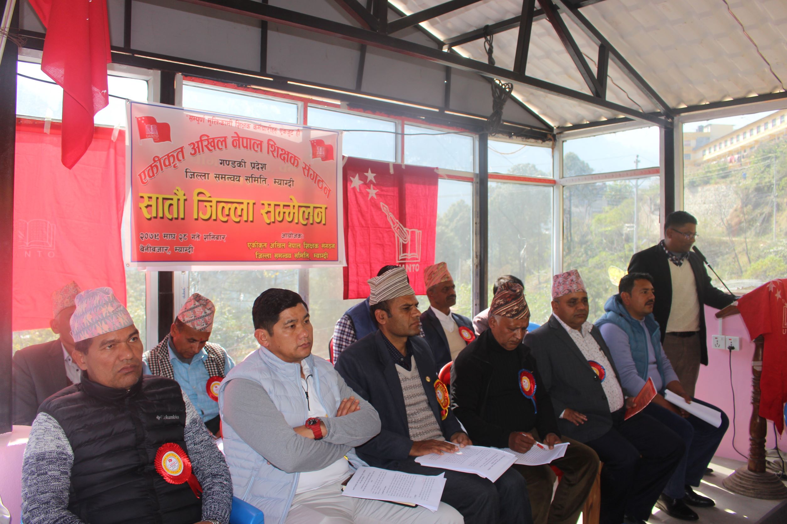 संगठनको उपाध्यक्षमा गोविन्द शर्मा, सचिवमा त्रिबिक्रम सुबेदी, कोषाध्यक्षमा खबहादुर किसान रहेको समिति सर्वसम्मत गठन गरिएको संगठनका बेनी नगरपालिका अध्यक्ष मदन सुवेदीले जानकारी दिनुभयो । शनिबार महारानीथानमा रहेको नेकपा (माओवादी केन्द्र) को पाटी कार्यालयमा एकीकृत अखिल नेपाल शिक्षक संगठन जिल्ला समन्वय समिति, म्याग्दीको सातौँ जिल्ला सम्मेलनलाई सम्वोधन गर्दै गण्डकी प्रदेशका उद्योग, पर्यटन, वन तथा वातावरण मन्त्री रेशमबहादुर जुग्जालीले स्थानीय रुपमा भएको उद्योग र पर्यटनको सम्भावनाहरुलाई उजागर गर्न शिक्षकको भूमिका महत्वपूर्ण हुने बताउनुभएको छ । उहाँले शिक्षकहरुबीचको बिभेद, बेतिथि, बिकृति हटाउन र शैक्षिक सुधारका लागि संगठित हुन शिक्षकहरुलाई आग्रह गर्नुभयो । सम्मेलनमा गण्डकी प्रदेश सरकार र मन्त्रालयको अवस्थाबारे जानकारी गराउनुभएको थियो ।