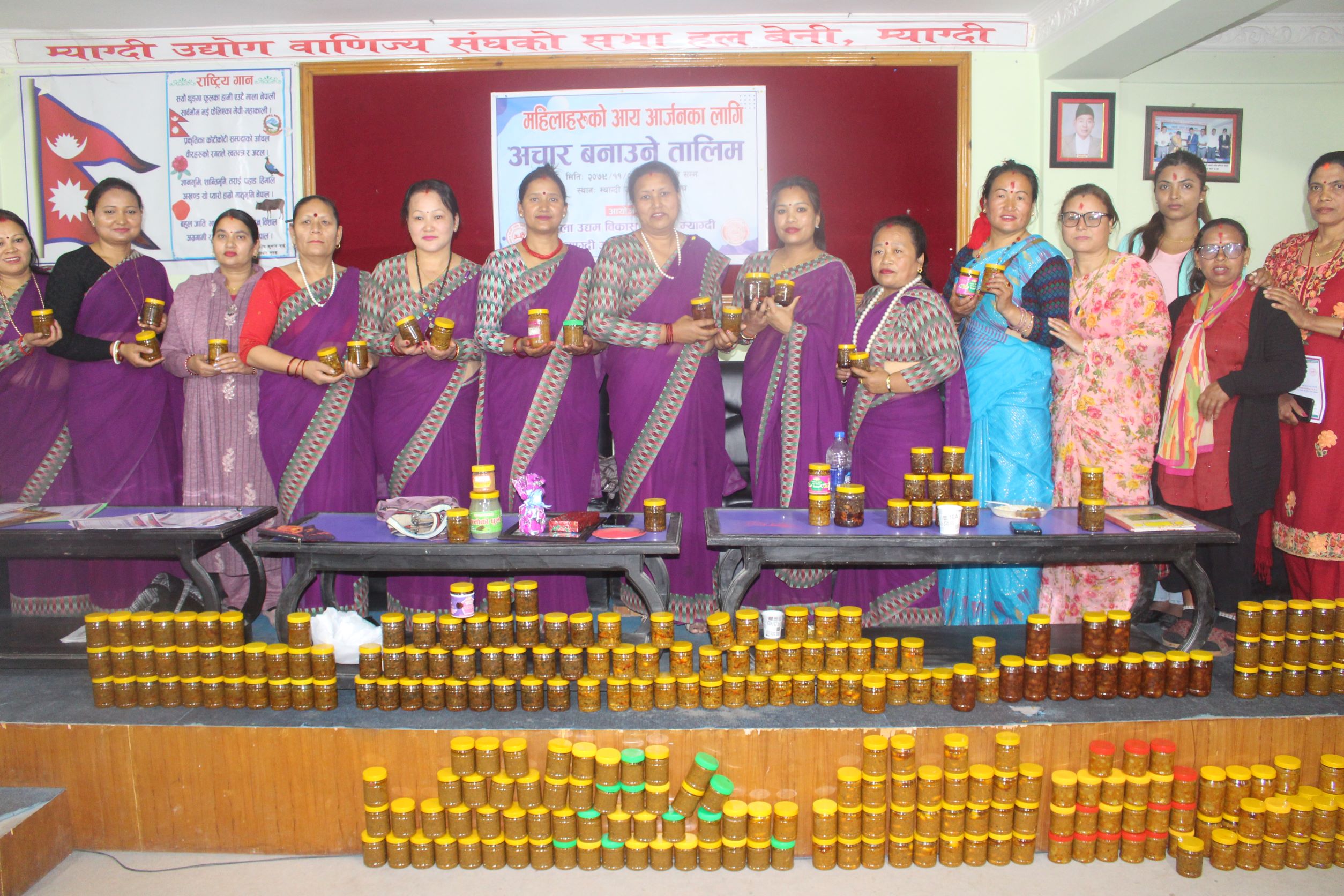 म्याग्दी, ५ फागुन । बेनीमा महिला उद्यमीहरुलाई ५ दिने अचार बनाउने तालिम दिईएको छ। म्याग्दी उद्योग वाणिज्य संघ र महिला उद्यम विकास समितिले महिलाहरुको आर्यआर्जन बढाउने उद्देश्यले उक्त तालिम संचालन गरेका हुन् ।