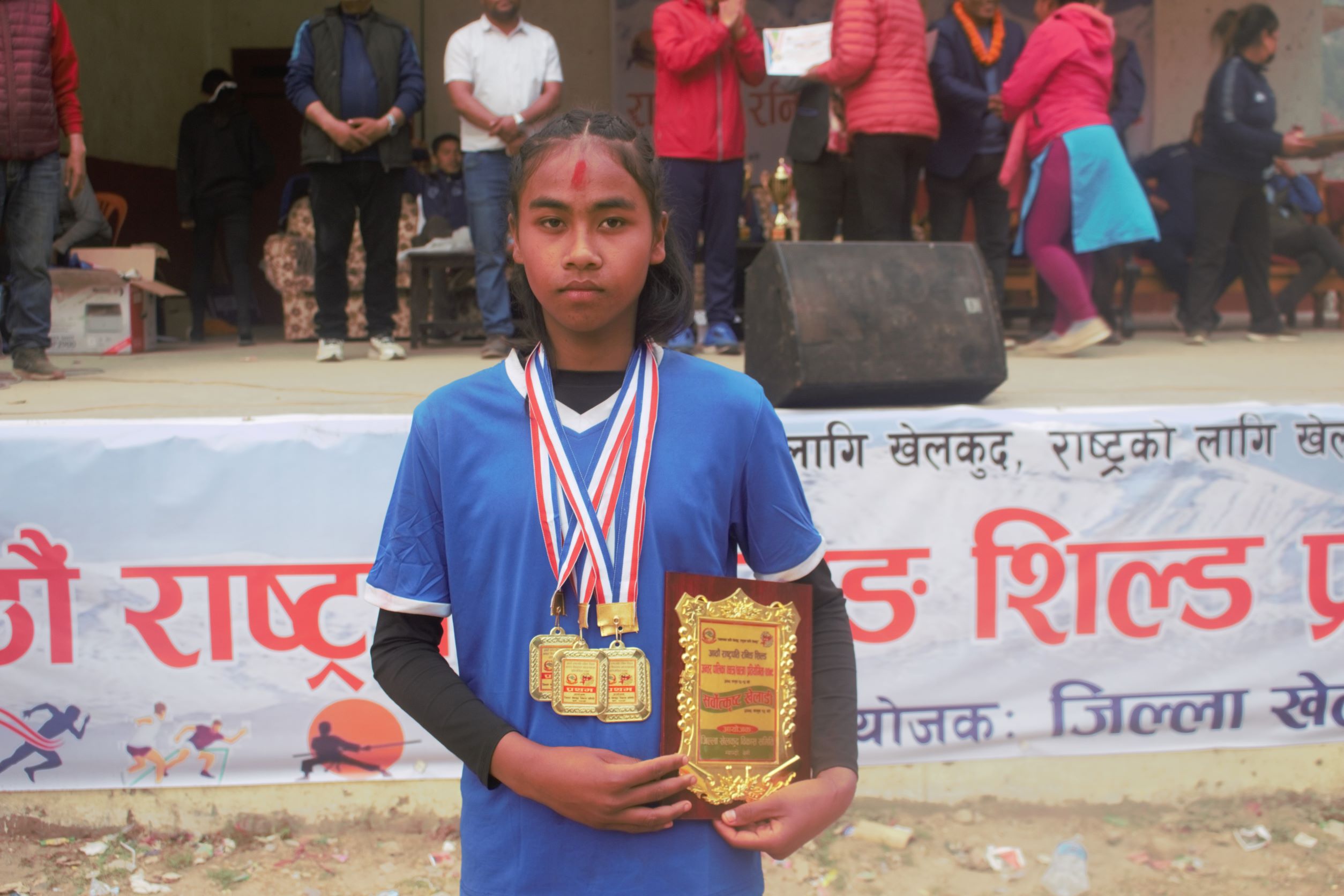म्याग्दी, १४ फागुन । बेनीमा सम्पन्न आठौँ जिल्ला स्तिरीय राष्ट्रपति रनिङ शिल्ड खेलकुद प्रतियोगितामा एथेलटिक्सतर्फ ४ स्वर्ण पदक जित्दै उत्कृष्ट खेलाडीको रुपमा पुरस्कृत हुनुभएकी मंगला गाउँपालिकाकी रिक्जना माझी । मंगला माविको कक्षा ८ मा अध्ययनरत रिक्झना माझीले तीन हजार, एक हजार पाचँसय मिटर सहित रिले दौड र त्रिपल जममा स्वर्ण जितेकी थिईन । तस्विर: धीरन खत्री