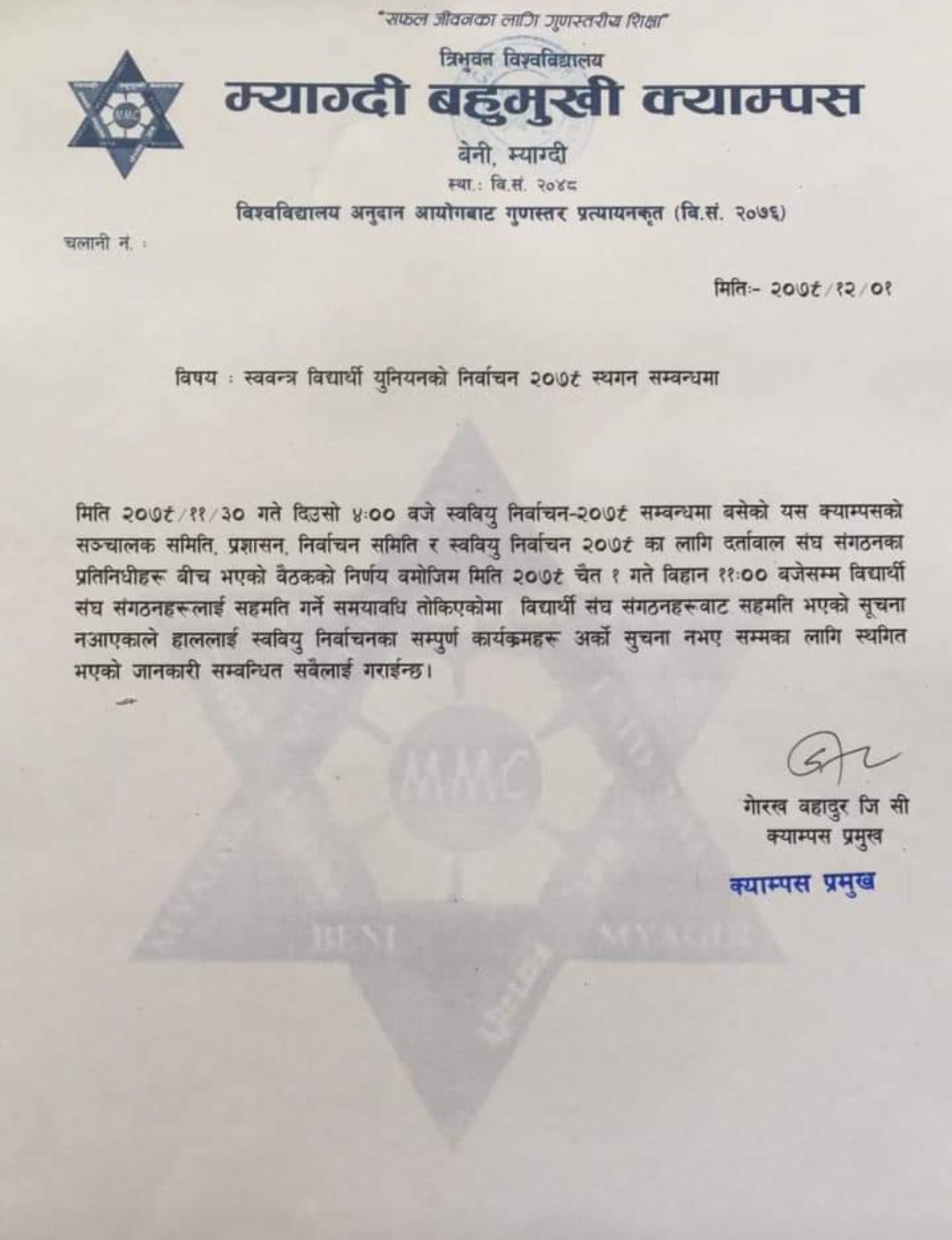 म्याग्दी १ चैत । बेनीमा रहेको म्याग्दी बहुमुखी क्याम्पसमा स्वतन्त्र विद्यार्थी युनियनको (स्ववियु) निर्वाचन स्थगित गरिएको छ । क्याम्पस प्रशासनले बुधवार (आज) सूचना जारी गर्दै अर्को सूचना जारी नभएसम्मका लागि चैत ५ गते हुने निर्वाचनका सम्पूर्ण कार्यक्रमहरु स्थगित गरेको जनाएको छ ।