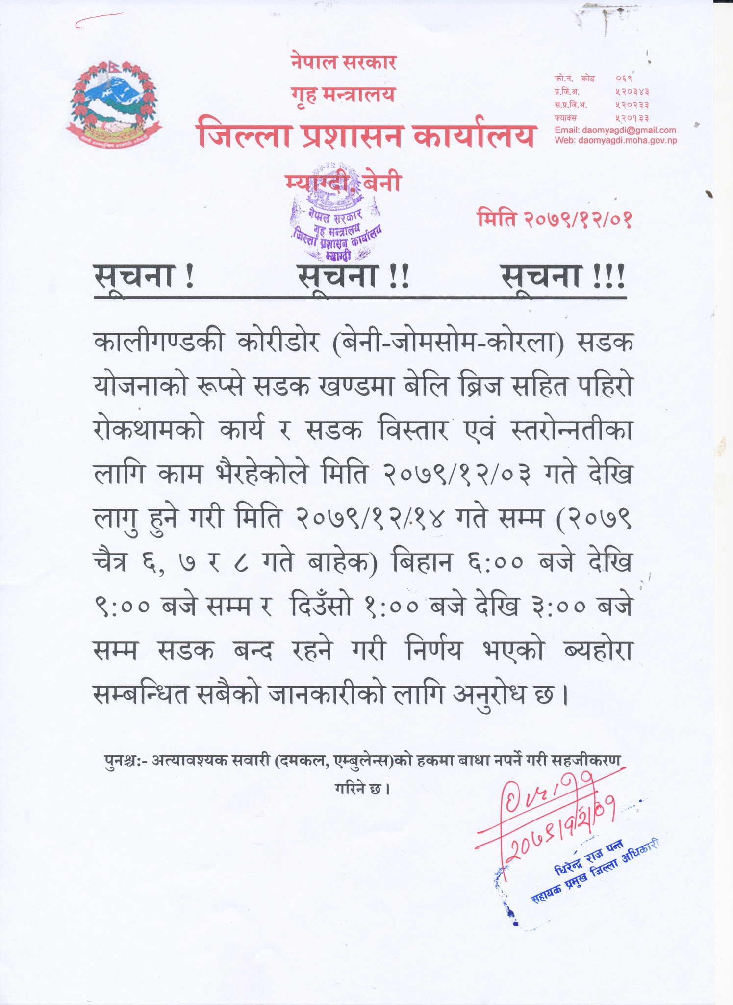 म्याग्दी प्रशासनले सूचना प्रकाशित गर्दै बेनी–जोमसोम सडक समय तालिका लागु गरिएको जनाएको छ । बेनी–जोमसोम सडकको प्याकेज नम्बर २ अन्तर्गत पर्ने अन्नपूर्ण गाउँपालिका–३ रुप्से सडक खण्डमा बेलीब्रिजसहित पहिरो रोकथामको कार्य भईरहेको र सडक विस्तार एवं स्तरोन्नतिका काम भईरहेकोले शुक्रबार बिहान ६ बजेदेखि ९ बजे सम्म र दिउँसो १ बजेदेखि दिउँसो ३ बजेसम्म सडक बन्द निर्णय गरेको म्याग्दीका सहायक प्रमुख जिल्ला अधिकारी धिरेन्द्रराज पन्तले जानकारी दिए ।