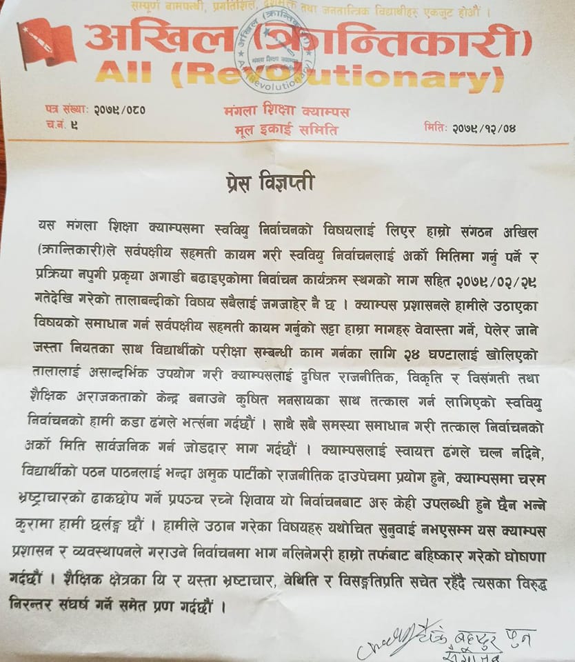 बेनी, ४ चैत । अखिल क्रान्तिकारीले मंगला शिक्षा क्याम्पसमा हुने स्ववियु निर्वाचन सर्वपक्षीय सहमती कायम गरेर निर्वाचन गर्न माग गर्दै चैत ५ गते हुने स्ववियु निर्वाचन बहिस्कार गरेको छ। अखिल क्रान्तिकारीको मागलाई सम्वोधन गर्दै सर्वपक्षीय सहमतिमा अर्को मितिमा निर्वाचन गर्न माग गर्दै चुनाव बहिस्कार गरेको हो ।