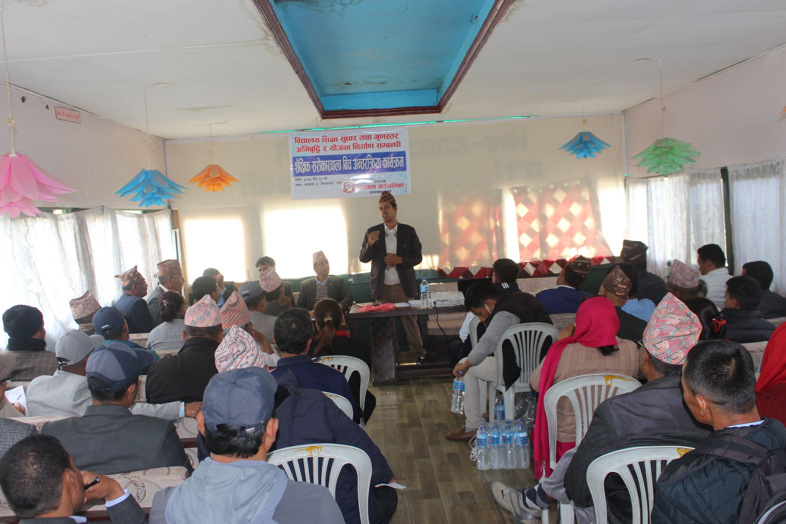 त्यस्तै गाउँपालिका अध्यक्ष आचार्यले शैक्षिक क्षेत्र तत्काल सुधार कार्ययोजना निर्माणलाई मूर्तरुप दिन तथा समग्र शैक्षिक गुणस्तर कायम गर्न सबैको भूमिका महत्वपूण हुने बताउनुभयो । उनले शैक्षिक सुधारका लागि शिक्षकहरु पनि जिम्मेवार बन्न आग्रह गरे । शैक्षिक क्षेत्रको सुधार योजना निर्माणदेखि कार्यान्वयन सम्म शिक्षक तथा प्रधानाध्यापक र विव्यस अध्यक्ष जिम्मेवार र अनुशासित विद्यार्थी भएमा शिक्षा क्षेत्र गुणस्तरीय बनाउन सहयोग पुग्ने भनाई राख्नुभयो । विद्यालयको प्रविधिमैत्री बनाउन गृहकार्य गाउँपालिकाले गरेको जानकारी गराउनुभयो । गाउँपालिका उपाध्यक्ष दिपक आचार्य र प्रमुख प्रशासकिय अधिकृत कुशल सुवेदीको उपस्थित रहेको थियो ।