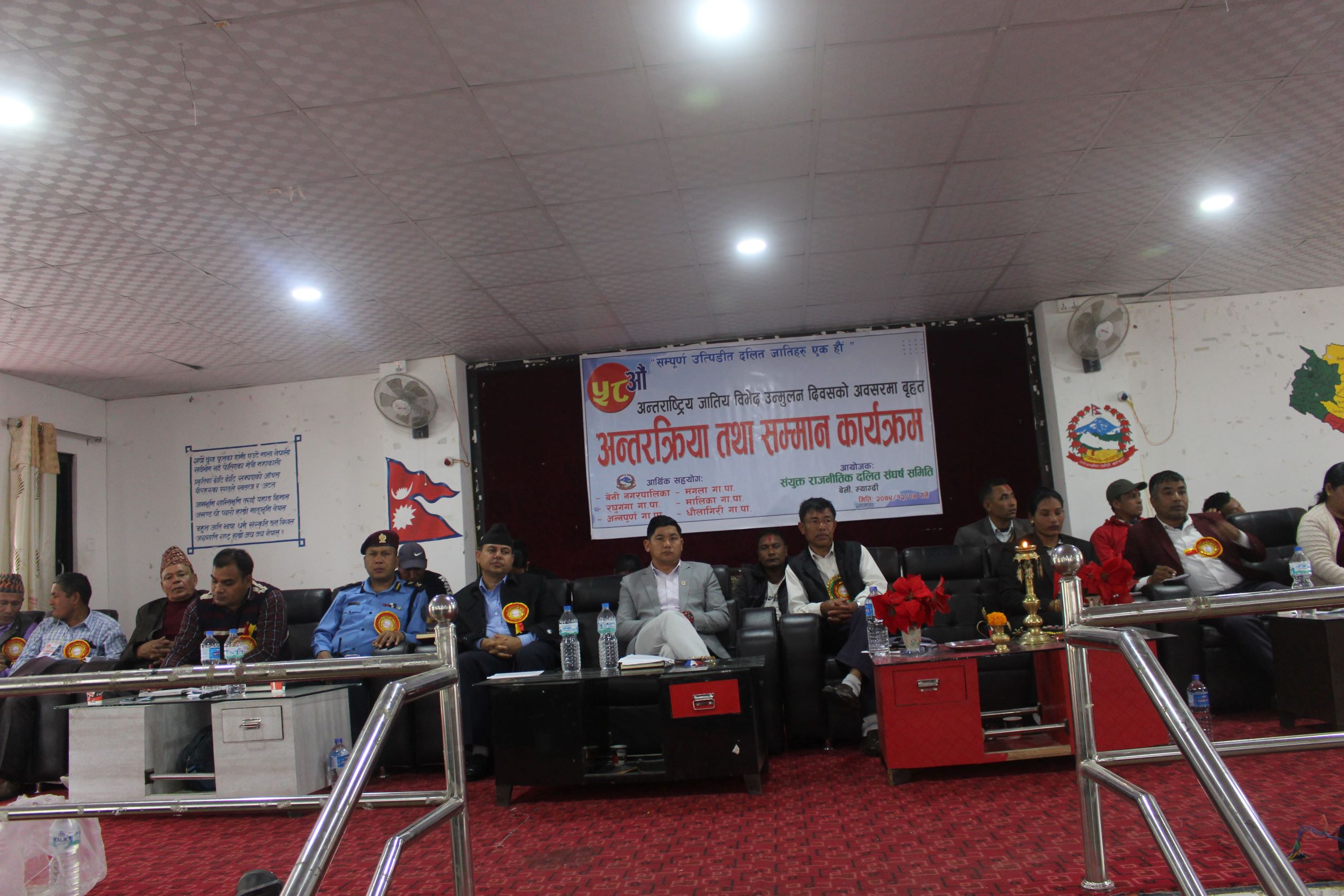 उत्पीडित जातीय मुक्ती समाजका केन्द्रिय सचिवालय सदस्य पुस्कर बि.क. र केन्द्रीय सदस्य खरमाया बिटालुले कानुनी अधिकारको प्रयोग गरेर विभेदजन्य घटनाको प्रतिकार गर्नुपर्ने बताउनुभयो । दलित अगुवा लालु किसानले कानुन र संविधानमा व्यवस्था भएको अधिकारको कार्यान्वयन हुन नसकेको बताउनुभयो । कार्यक्रममा गत स्थानीय तह निर्वाचनमा निर्वाचित दलित समुदायका जनप्रतिनिधी र विभिन्न सामाजिक संघ संस्थाको नेतृत्वमा पुगेका दलित समुदायका व्यक्तिहरुलाई सम्मान गरिएको संयुक्त राजनीतिक दलित संघर्ष समिति म्याग्दीका अध्यक्ष पदम किसानले बताउनुभयो ।