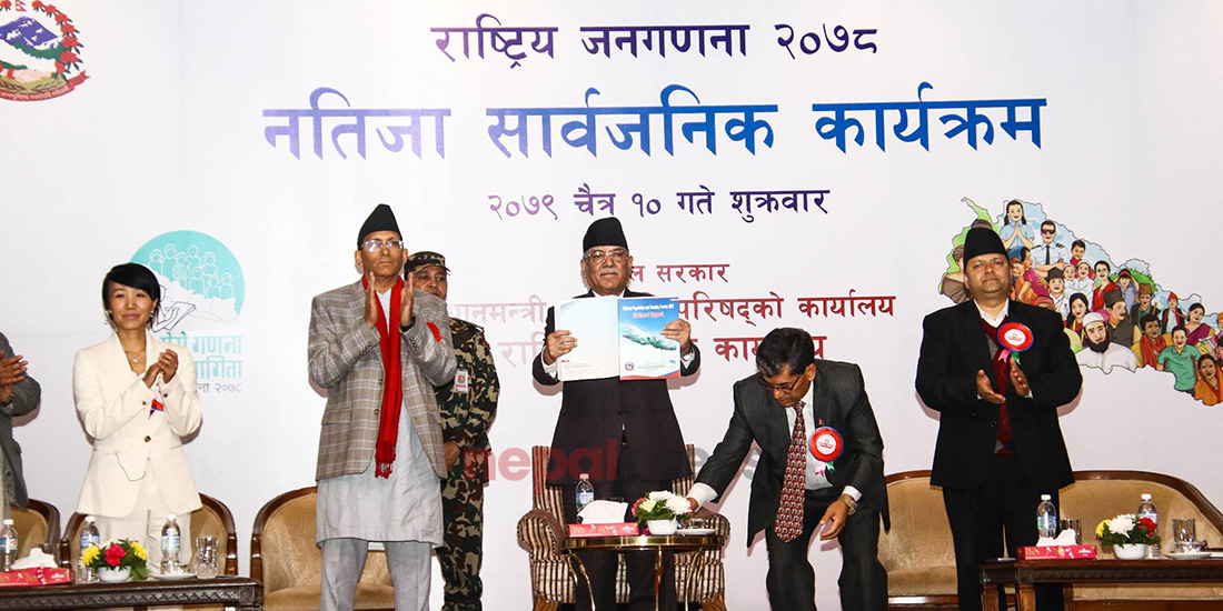 काठमाडौं, १० चैत । प्रधानमन्त्री पुष्पकमल दाहाल ‘प्रचण्ड’ले राष्ट्रिय जनगणना २०७८ को नतिजा सार्वजनिक गरेका छन् । राष्ट्रिय जनगणना २०७८ अनुसार (जनगणना सन्दर्भ दिन २०७८ साल मंसिर ९ गते) नेपालको जनसंख्या २ करोड ९१ लाख ६४ हजार ५७८ रहेको छ । जसमध्ये पुरुषको संख्या १ करोड ४२ लाख ५३ हजार ५५१ (४८.९८ प्रतिशत) र महिलाको संख्या १ करोड ४९ लाख ११ हजार २७ (५१.०२ प्रतिशत) छ।