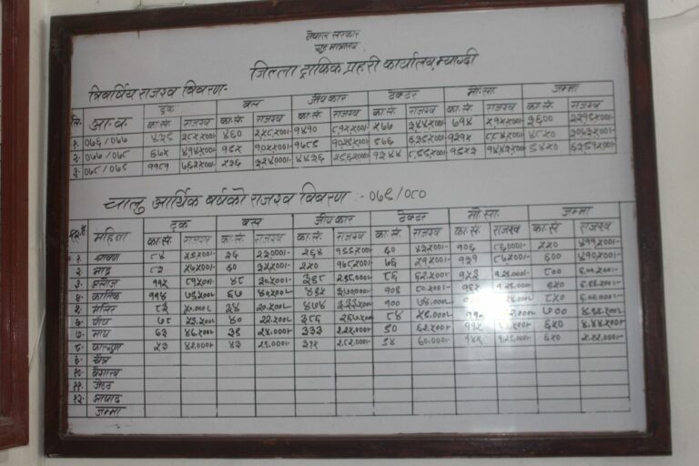 चालु आवको साउनमा ४ लाख ११ हजार ५००, भदौमा ४ लाख १० हजार ५००, असोजमा ६ लाख १ हजार ५००, कात्तिकमा ६ लाख ९९ हजार ५००, मंसिरमा ६ लाख २ हजार, पुसमा ६ लाख ९४ हजार ५००, माघमा ४ लाख ४४ हजार ५००, फागुनमा ५ लाख ५२ हजार रुपैयाँ राजश्व संकलन गरेको छ।