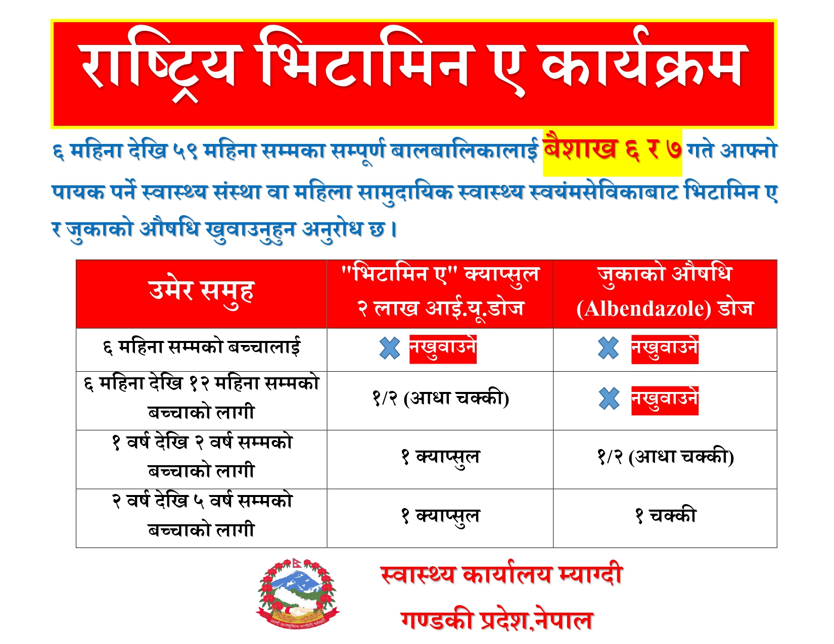 म्याग्दी, ६ बैशाख । सरकारले आज र भोलि बालबालिकालाई भिटामिन ए र जुकाको औषधि खुवाउने भएको छ ।