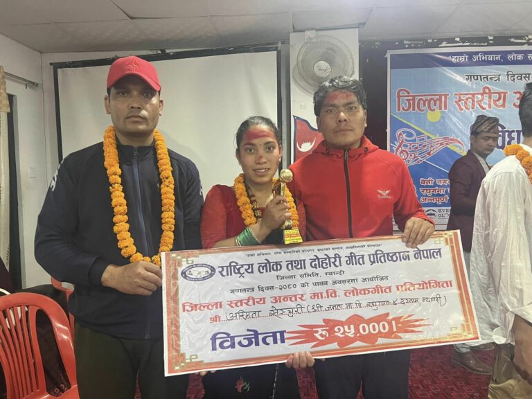 म्याग्दी, १६ जेठ । राष्ट्रिय लोक तथा दोहोरी गीत प्रतिष्ठान म्याग्दीले गणतन्त्र दिवसको अवसरमा आयोजना गरेको जिल्ला स्तरीय अन्तरमावि लोक गीत प्रतियोगितामा जनता मावि दग्नामकी अस्मिता सेन्चुरी प्रथम हुनुभएको छ । सोमवार जिल्ला समन्वय समितिको सभाहलमा आयोजित १९ वटा विद्यालयको सहभागिता रहेको प्रतियोगितामा विजेता बन्दै सेन्चुरीले नगर रु २५ हजार सहित ट्रफि प्रमाणपत्र पुरस्कार प्राप्त गर्नुभएको हो ।