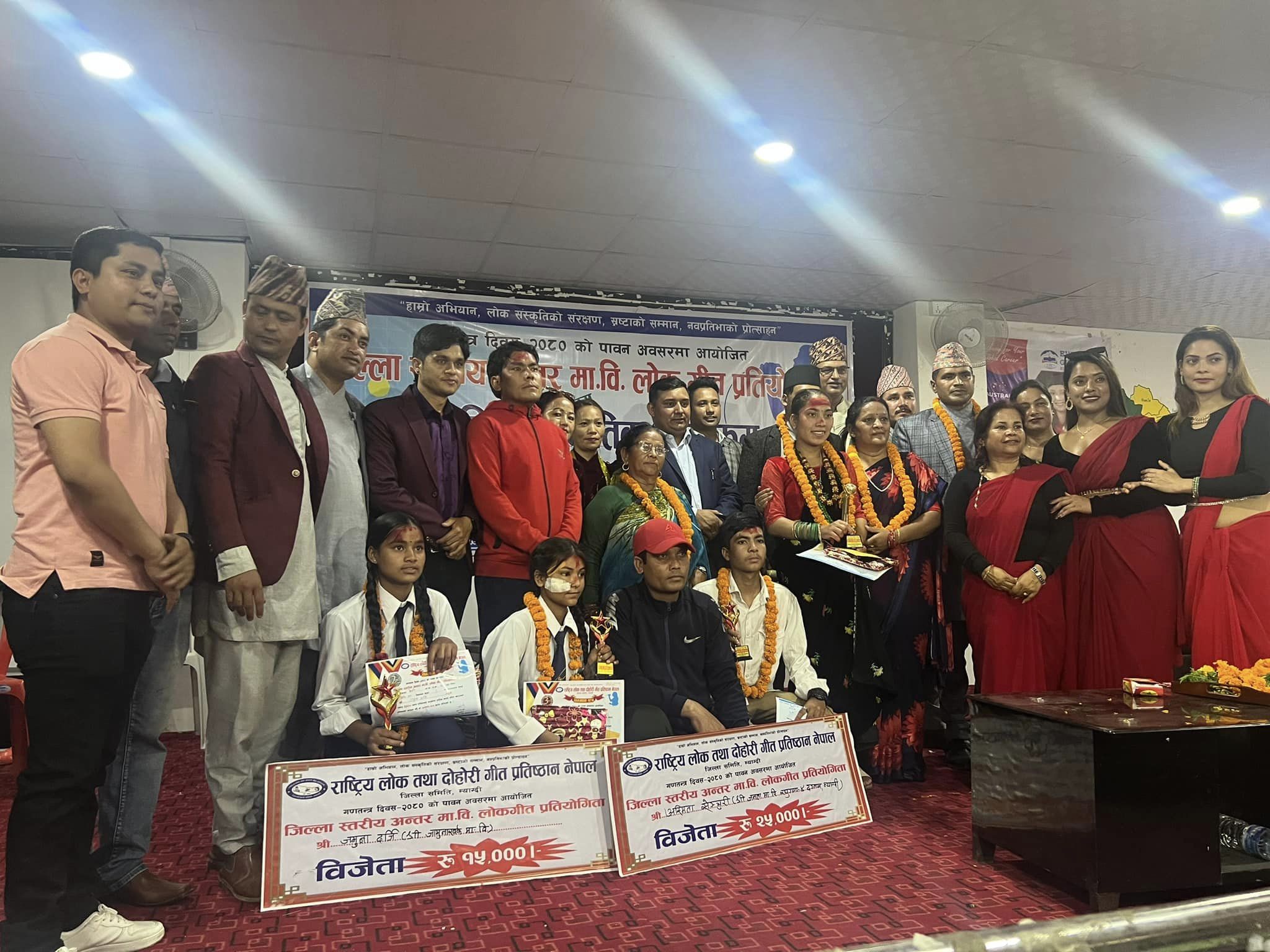 म्याग्दी, १६ जेठ । राष्ट्रिय लोक तथा दोहोरी गीत प्रतिष्ठान म्याग्दीले गणतन्त्र दिवसको अवसरमा आयोजना गरेको जिल्ला स्तरीय अन्तरमावि लोक गीत प्रतियोगितामा जनता मावि दग्नामकी अस्मिता सेन्चुरी प्रथम हुनुभएको छ । सोमवार जिल्ला समन्वय समितिको सभाहलमा आयोजित १९ वटा विद्यालयको सहभागिता रहेको प्रतियोगितामा विजेता बन्दै सेन्चुरीले नगर रु २५ हजार सहित ट्रफि प्रमाणपत्र पुरस्कार प्राप्त गर्नुभएको हो ।