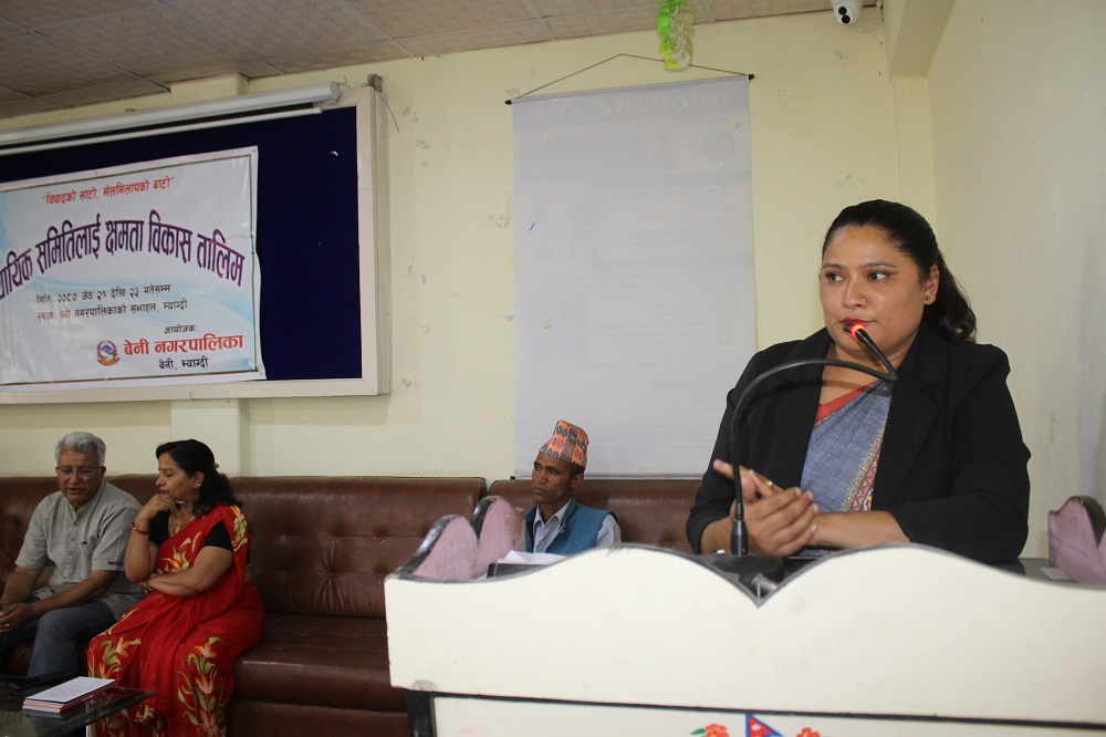 वडा स्तरमा मेलमिलाप केन्द्र सञ्चालन गर्न आवश्यक जनशक्ति तयार पार्ने र सूचिकृत मेलमिलापकर्ताहरुको क्षमता विकास गर्ने उद्देश्यले कार्यक्रम आयोजना गरिएको बेनी नगरपालिकाका उपप्रमुख ज्योती लामिछानेले जानकारी दिए ।