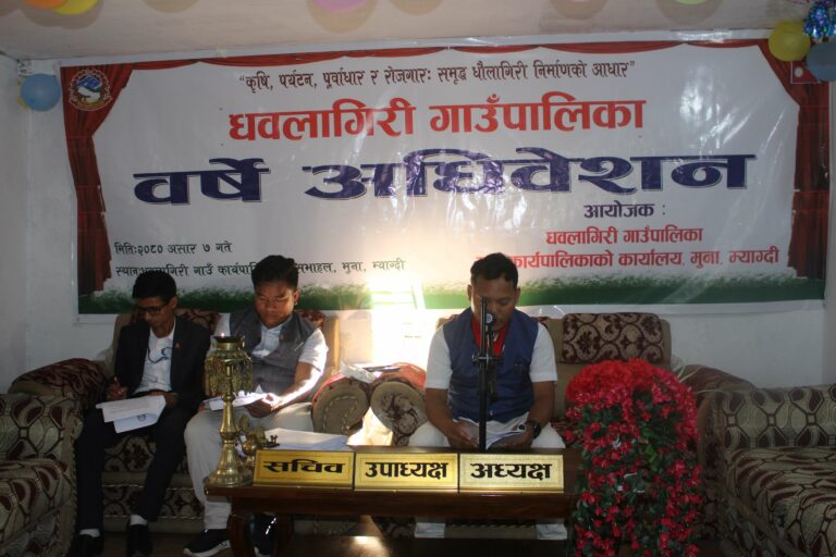 म्याग्दी, ७ असार । धवलागिरी गाउँपालिकाले आगामी आर्थिक वर्ष २०८०÷०८१ को लागि पूर्वाधार, शिक्षा, स्वास्थ्य, सामाजिक विकास र रोजगारी सिर्जना तथा आयआर्जन सुधारका कार्यक्रमलाई जोड दिने नीति तथा कार्यक्रम ल्याएको छ । मुना स्थित गाउँपालिकाको केन्द्रमा बिहिबारदेखि शुरु भएको बिसौ गाउँसभामा अध्यक्ष प्रेमप्रसाद पुनले प्रस्तुत गर्नुभएको नीति तथा कार्यक्रम पारित भएको छ । टोल, वडा, विषयगत समिति र कार्यपालिकामा छलफल गरि उपलब्धी देखिने र सिमित स्रोतबाट नागरिकका अधिकतम अपेक्षा सम्बोधन गर्न सकिने किसिमका योजना तथा कार्यक्रमलाई जोड दिएको अध्यक्ष पुनले बताउनुभयो ।