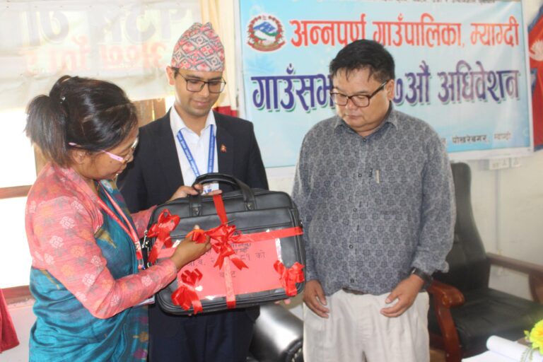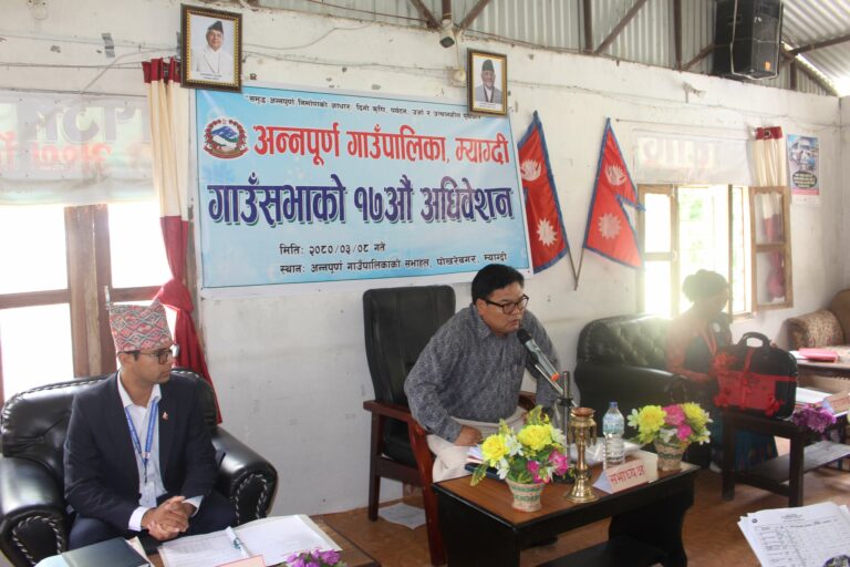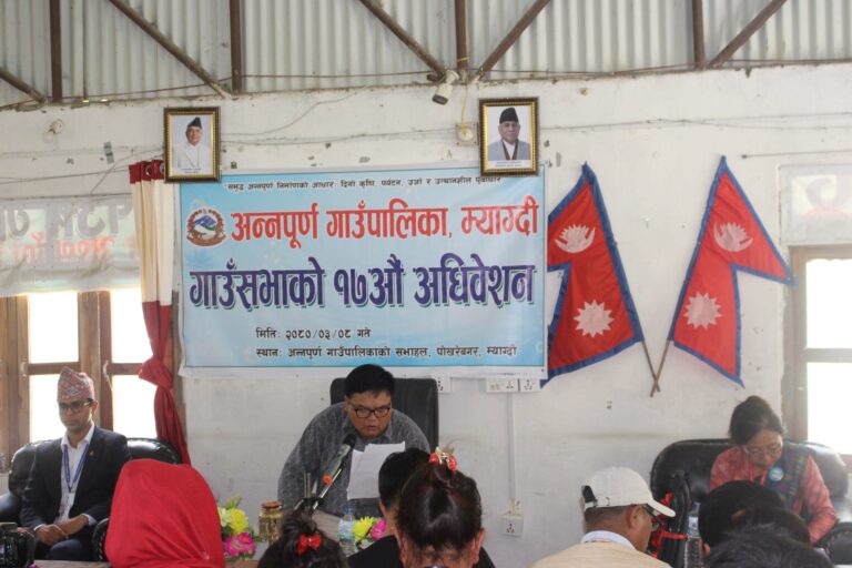 म्याग्दी, ८ असार । अन्नपूर्ण गाउँपालिकाले आगामी आर्थिक वर्ष २०८०/०८१ का लागि साढे ५३ करोडको बजेट सार्वजनिक गरेको छ । गाउँपालिकाको केन् पोखरेबगरमा शुक्रबार शुरु भएको सत्रौ गाउँसभामा उपाध्यक्ष दिवा तिलिजा पुनले रु. ५३ करोड ५४ लाख ४३ हजार ६०० को बजेट सार्वजनिक गर्नुभएको हो । चालुतर्फ रु. ३५ करोड ५१ लाख ५९ हजार ६०० र पुजिगततर्फ रु.१८ करोड दुई लाख ८४ हजार बजेट बिनियोजन भएको उपाध्यक्ष तिलिजाले बताउनुभयो ।