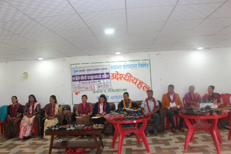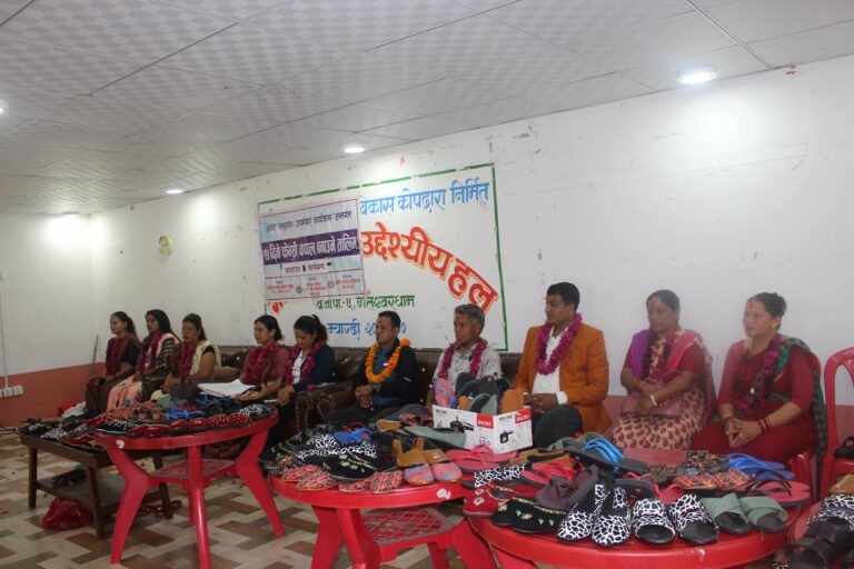 “परिवार देखि समाजको गरिवी न्यूनिकरण गराउनका लागि सिकेको सिपलाई ब्यवसायीकरण रुपमा अघि बढाएमा सहयोग पुग्छ। दिदिबहिनीलाई ब्यवसायीक रुपमा अघि बढाउन परिवारदेखि समाजको साथसहयोग हुनुपर्छ।”– उहाँले भन्नुभयो । “चप्पल बनाउने सिपमा ब्यावसायीक रुपमा अघि बढाउन यहाँहरुले सक्रियता देखाउनुभयो भने उद्योग स्थापना लगायतको कार्यक्रममा नगरपालिकाले अनुदान उपलब्ध गराउने छ । उत्पादन भएका बस्तुलाई बजारिकरणको लागि पनि साथ सहयोग रहनेछ ।”