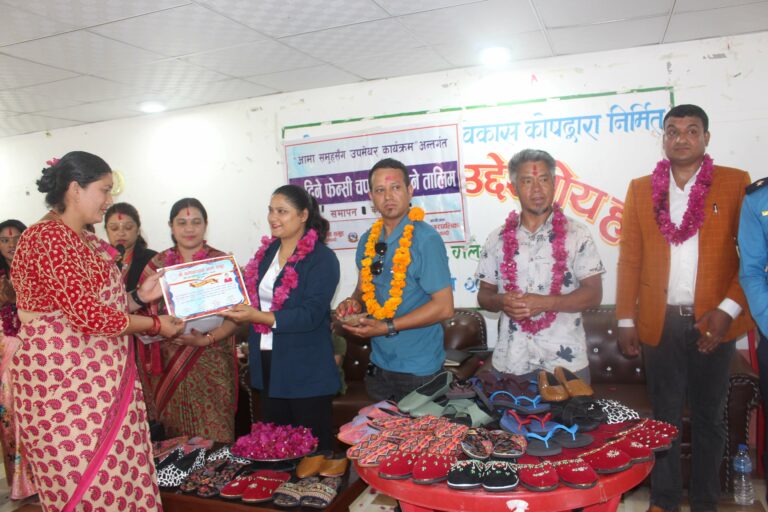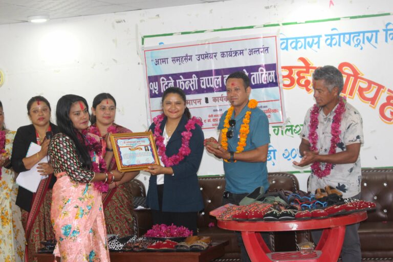 म्याग्दी, ९ असार । “आमासमूहसँग उपमेयर कार्यक्रम” अन्तरगत बेनी नगरपालिका–९ गलेश्वरमा १५ दिने फेन्सी चप्पल बनाउने तालिम सम्पन्न भएको छ। बेनी नगरपालिकाको आयोजना, वडाको समन्वय र गलेश्वरधाम आमासमूहको संयोजनमा संचालित चप्पल बनाउने तालिम शनिबार सम्पन्न भएको हो ।