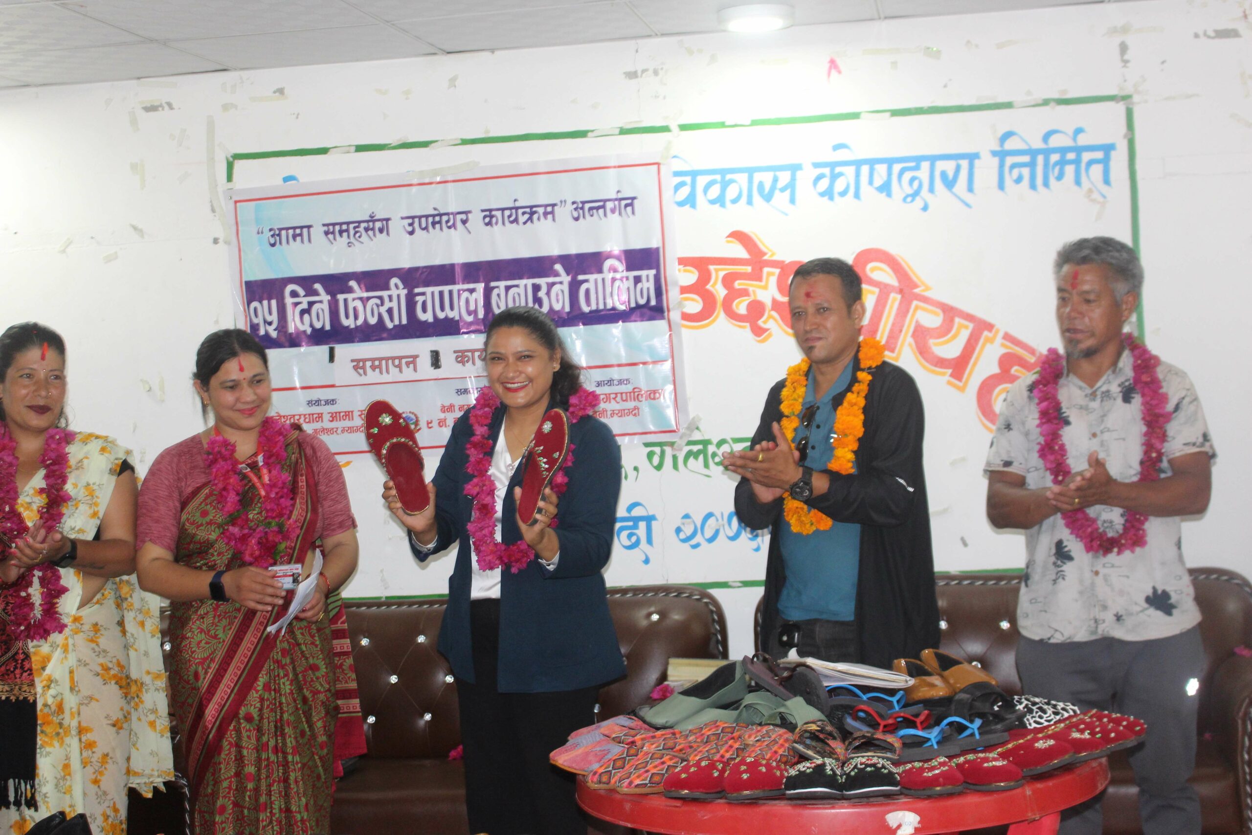 म्याग्दी, ९ असार । “आमासमूहसँग उपमेयर कार्यक्रम” अन्तरगत बेनी नगरपालिका–९ गलेश्वरमा १५ दिने फेन्सी चप्पल बनाउने तालिम सम्पन्न भएको छ। बेनी नगरपालिकाको आयोजना, वडाको समन्वय र गलेश्वरधाम आमासमूहको संयोजनमा संचालित चप्पल बनाउने तालिम शनिबार सम्पन्न भएको हो ।
