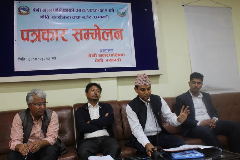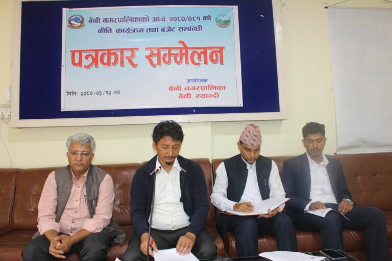 बेनी नगरपालिका प्रवक्ता एवम् वडानम्वर ७ का वडाअध्यक्ष रमेशकुमार श्रेष्ठले शिक्षा, स्वास्थ्य, सडक, पूर्वाधार, कृषि, खेलकुद पर्यटन लगायतमा समेटिएको विषयबस्तु र बजेटबारे जानकारी गराउनुभएको थियो । पत्रकार सम्मेलन नगरको विकासमा टेवा पुग्ने गरी गण्डकी प्रदेश सरकारबाट नगरलाई प्राथमिकता दिएर बजेट विनियोजन गर्नुहुने भौतिक पूर्वाधार मन्त्री रेशम जुग्जाली, सदस्यद्वय हरी भण्डारी र विमला गौचनलाई धन्यवाद दिनुभएको थियो ।