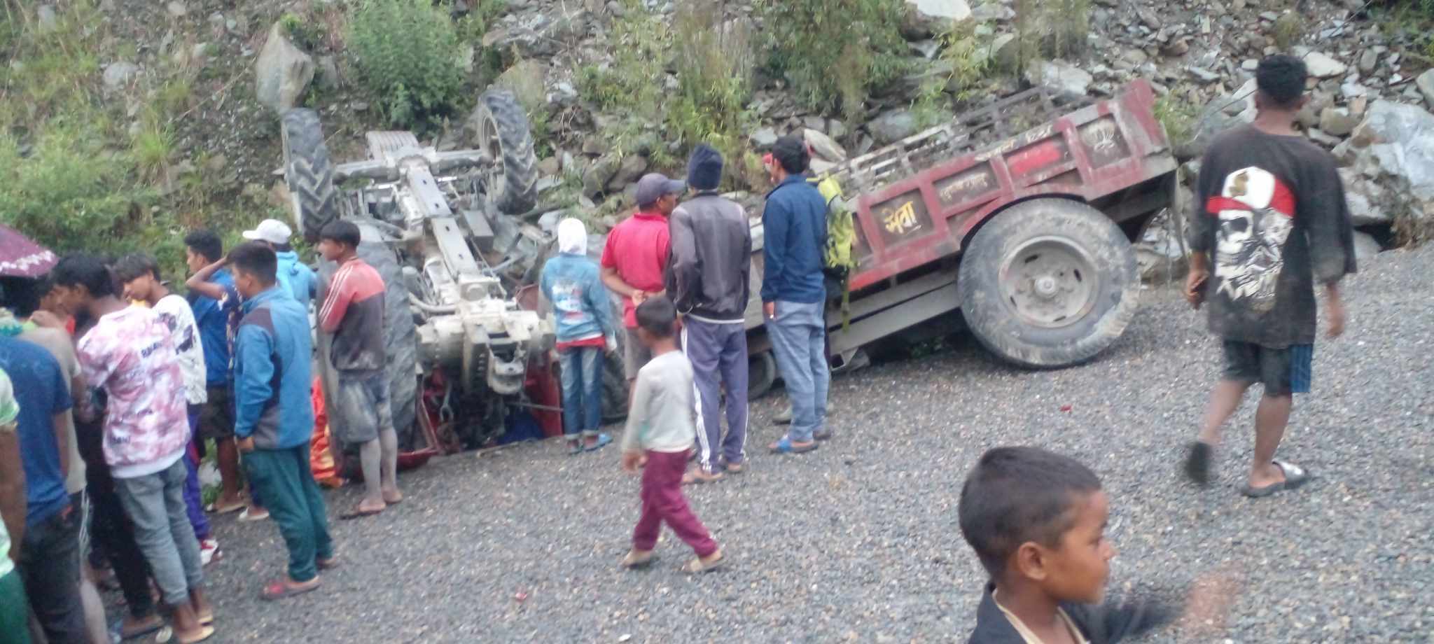 रघुगंगाको वडानम्वर २ राखु भगवतीबाट वडानम्वर ३ पिप्ले तीर सामानहरु लिएर आउदै गरेको ग १ च ७२८१ नम्वरको ट्याक्टर सडकमा अनियन्त्रित भएर दुघंटना भएको थियो ।