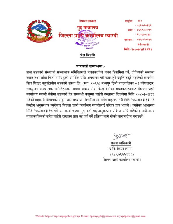 बचतकर्ताहरुले सहकारी ऐन सम्बन्धी कसुरमा जाहेरी दरखास्त दिएकोमा सहकारी विभागको अनुसन्धान सम्बन्धी सिफारिस पत्र समेत सङ्लग्न गरी केन्द्रीय अनुसंधान ब्युरोबाट भएको परिपत्र बमोजिम असार १७ गते जिल्ला प्रहरी कार्यालय म्याग्दीमा मुद्धा दर्ता भई अनुसन्धान प्रक्रिया अघि बढेको कार्यालयका सूचना अधिकारी प्रहरी निरिक्षक किरण लामाले जानकारी दिनुभयो ।