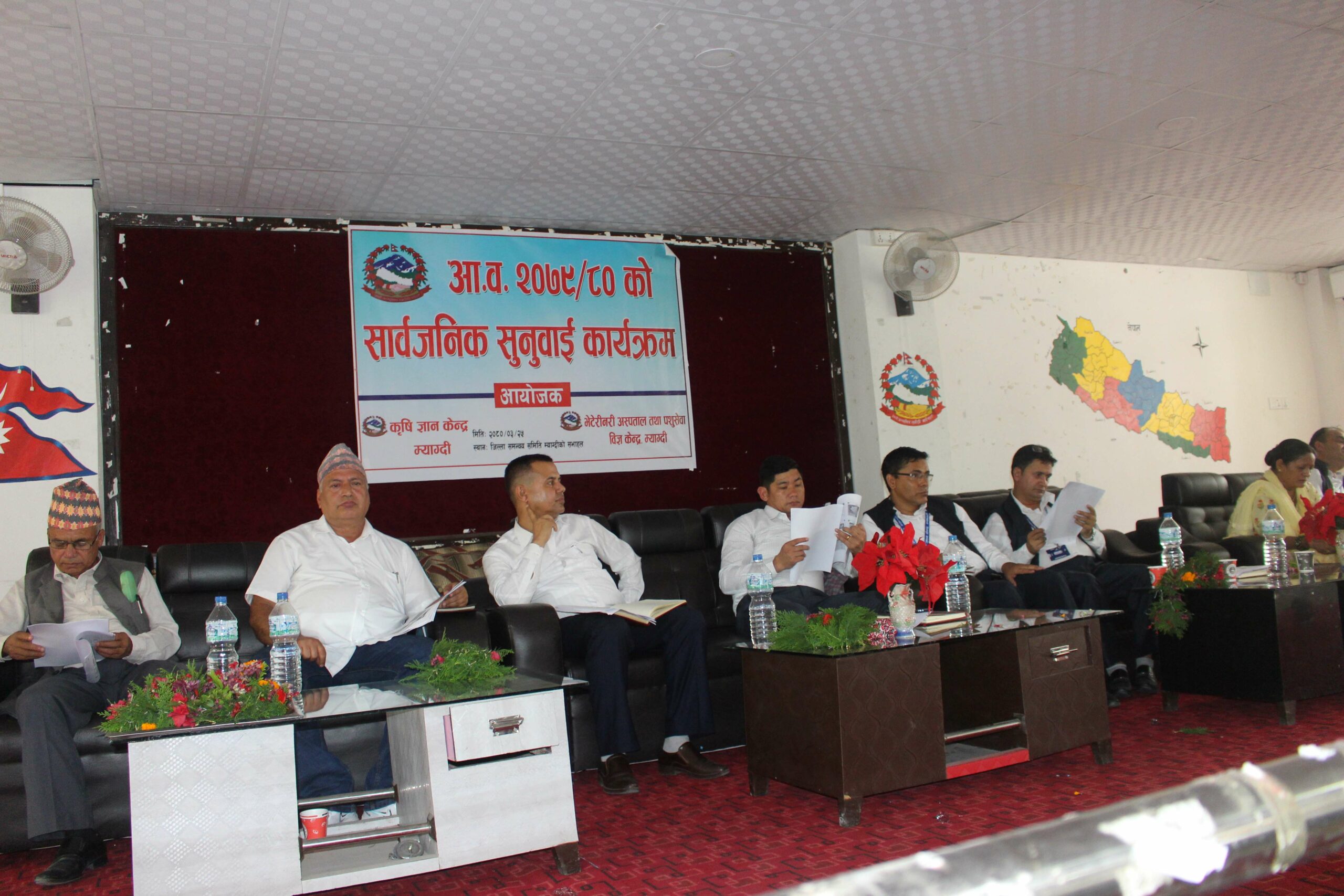 प्रमुख सिग्देलको अध्यक्षता, निमित्त प्रमुख सुवेदीको स्वागत, कृषि ज्ञान केन्द्रका सहायकस्तर पाँचौं भोलानाथ आचार्यले सञ्चालन गर्नुभएको सार्वजनिक सुनुवाई कार्यक्रमको सहजीकरण पत्रकार सन्तोष गौतम, साधन राम्जाली र प्रताप बानियाँले गर्नुभएको थियो ।