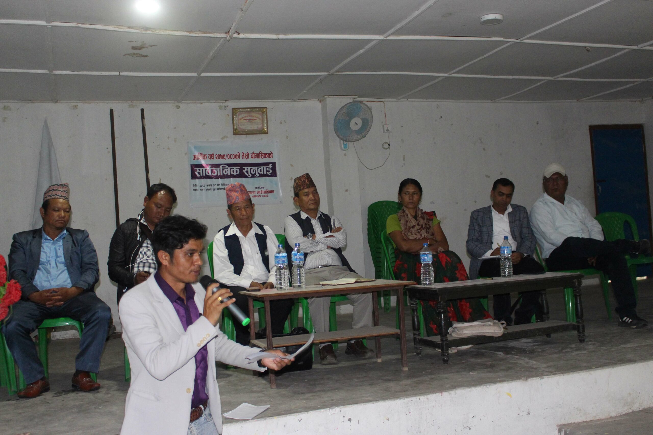 गाउँपालिका अध्यक्ष रोकाको अध्यक्षता, प्रमुख प्रशासकिय अधिकृत पौडेललको स्वागत मन्तव्य रहेको कार्यक्रमको संचालन सूचना अधिकारी राजेन्द्र आचार्यले गर्नुभएको थियो । वडाअध्यक्ष,कर्मचारी, राजनीकि दलका प्रतिनिधि र मंगलाबासीको उपस्थितमा भएको सार्वजनिक सुनुवाई कार्यक्रमको सहजीकरण पत्रकार अमित विश्वकर्माले गर्नुभएको थियो ।