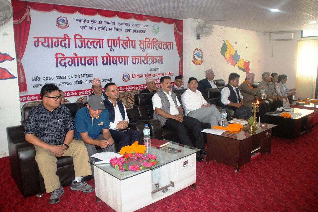 जिल्ला खोप समन्वय समितिले विहिवार बेनीमा आयोजना गरेको समारोहमा गण्डकी प्रदेशका भौतिक पूर्वाधार तथा यातायात व्यवस्था मन्त्री रेशमबहादुर जुग्जाली, प्रदेश सभा सदस्य हरि भण्डारी, जिल्ला समन्वय समितिका प्रमुख राजकुमार थापा, गण्डकी प्रदेश सामाजिक विकास तथा स्वास्थ्य मन्त्रालयका सचिव विनोदबिन्दु शर्मा लगायतले पूर्णखोप सुनिश्चिता दिगोपनालाई निरन्तरता दिने प्रतिबद्धतामा हस्ताक्षर गर्नुभएको थियो ।
