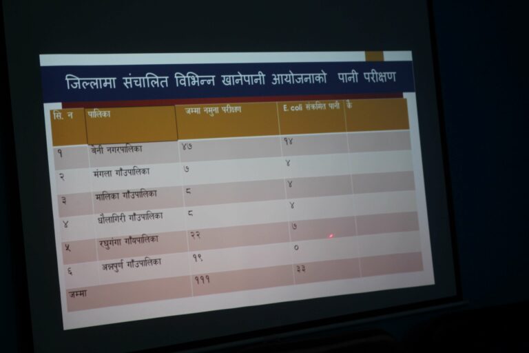 स्थानीय तहहरुमा एकसय ११ वटा खानेपानीको मुहान परिक्षण गर्दा ३३ वटा मुहानमा पीउन अयोग्य ‘इकोली’ जिवाणु मिसिएको भेटिएको छ। बेनीमा १४ वटा, मंगला, मालिका र धवलागिरीमा चार÷चार वटामा रघुगगामा ७ वटामा संक्रमित भेटिएको कार्यालय प्रमुख लम्सालले जानकारी दिनुभयो । आगामी आर्थिक बर्ष जिवाणु भेटिएको मुहानमा पानी शुद्धिकरण सम्वन्धी कार्यक्रम सञ्चालन गरिने स्वास्थ्य कार्यालयले जानकारी दिएको छ।