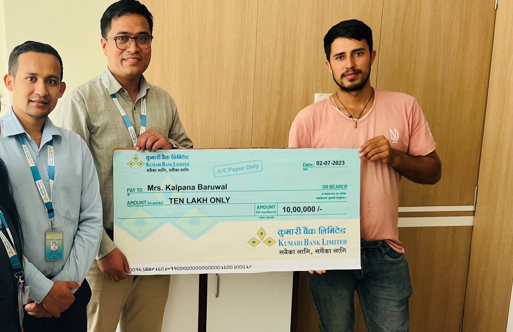 म्याग्दी, १ साउन । कुमारी बैंक लिमिटेडले सुरक्षा बचत खाता योजना अन्तर्गत दुर्घटनामा परी ज्यान गुमाएको ग्राहकको परिवारलाई बीमा बापतको १० लाख रकम हस्तान्तरण गरिएको छ । उक्त परिवारलाई कुमारी बैंक लिमिटेडको बेनी शाखा मार्फत यो रकम हस्तान्तरण गरिएको हो ।