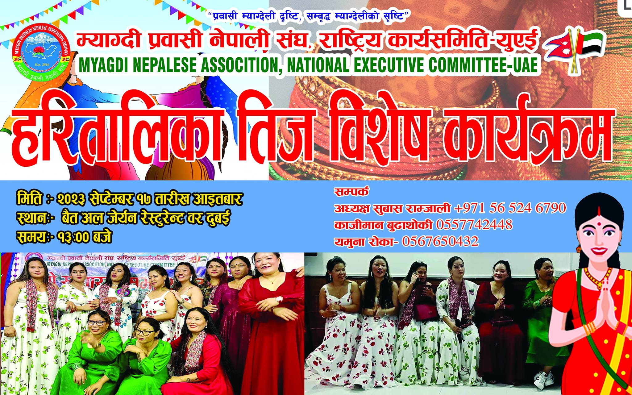म्याग्दी, १० साउन । म्याग्दी प्रवासी नेपाली संघ (मोना) युएईले नेपाली महिलाहरुको महान चार्ड हरितालिका तिज पर्वमा विशेष कार्यक्रम गर्ने भएको छ।