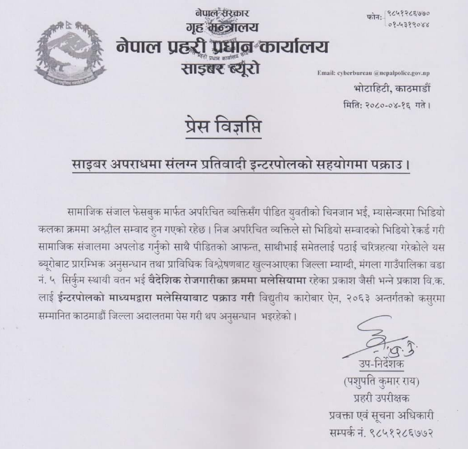 सामाजिक संजालबाट चिनजान भएकी युवतीको म्यासेन्जरमा भिडियो कलका क्रममा भएका अश्लील सम्वादको भिडियो रेकर्ड गरी सामाजिक संजालमा अपलोड गरेको पीडित युवतीको आफन्तको उजुरीपछि उनलाई साईवर ब्यूरोले इन्टरपोलको सहयोगबाट मलेशियाबाट प्रकाउ गरिएको साईवर ब्यूरोका सूचना अधिकारी पशुपति कुमार रायले प्रेस विज्ञप्ति मार्फत सार्वजनिक गर्नुभएको छ।