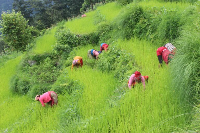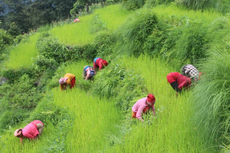 म्याग्दी, २१ साउन । म्याग्दीको रघुगंगा गाउँपालिका– २ राखु भगतवीका कृषकहरु असारमा रोपेको धान खेतीलाई सामुहिक रुपमा गोड्दै । अर्मपर्ममार्फत खेत गोडमेल प्रचलन हट्दै गएको छ।