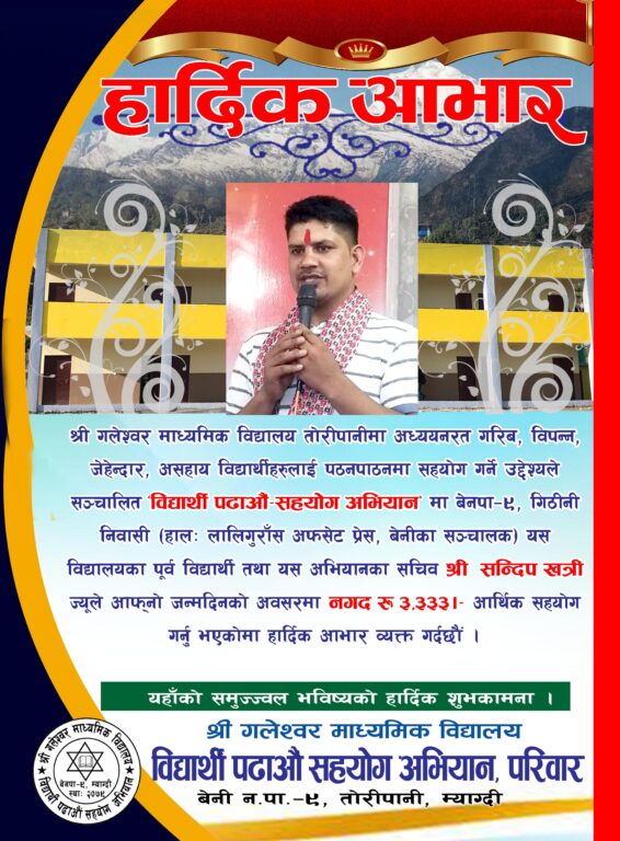 शनिबार उहाँले अध्ययन गरेको बेनी नगरपालिका वडानम्वर ९ तोरीपानीमा रहेको गलेश्वर माविले स्थापना गरेको अक्षकोषमा तीन हजार ३३३ रुपैयाँ आर्थिक सहयोग गर्नुभएको छ ।