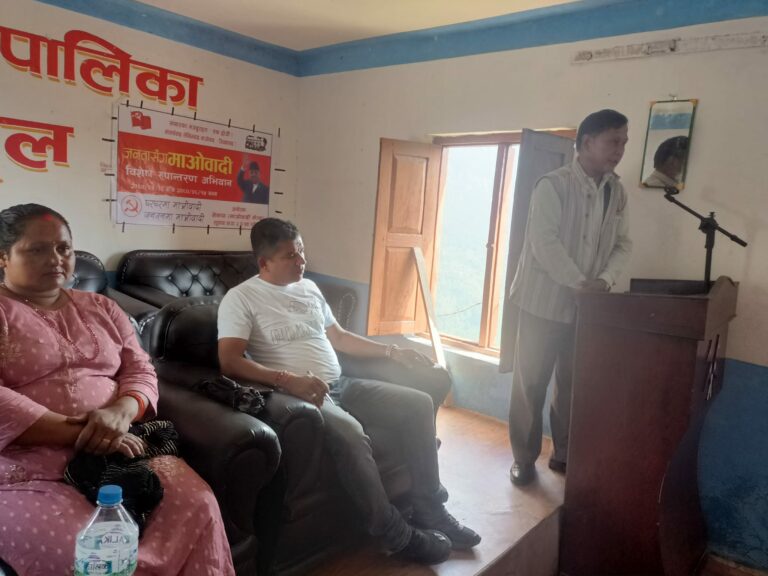 म्याग्दी, १६ भदौ । नेकपा माओवादी केन्द्रको तीन महिने अभियान म्याग्दीमा पनि सुरु भएको छ । प्रधानमन्त्रीसमेत रहेका पार्टी अध्यक्ष पुष्पकमल दाहाल प्रचण्डले ‘जनतासँग माओवादी विशेष रूपान्तरण अभियान’ को भर्चुअल माध्यमबाट देशका सबै वडाहरूमा एकसाथ उद्घाटन गरेपछि म्याग्दीमा पनि माओवादीका नेताहरु तोकिएका वडामा पुगेर अभियान सुरु गर्नुभएको हो ।