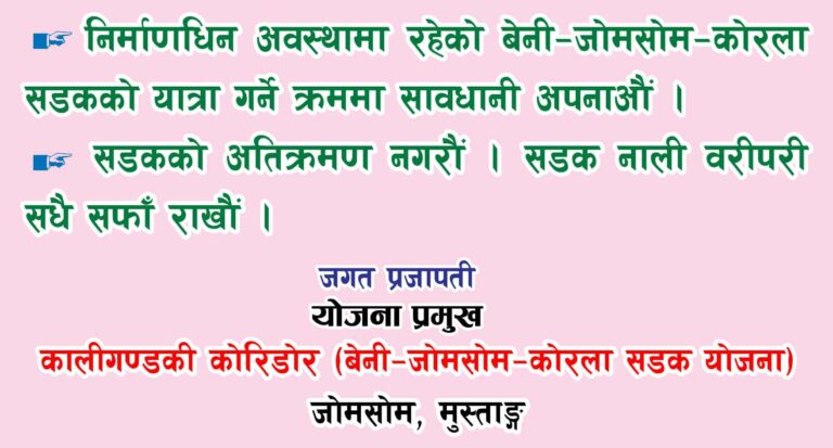 म्याग्दी, २१ भदौ । उत्तर दक्षिण जोड्ने कालीगण्डकी कोरीडोरको बेनी–जोमसोम–कोरला सडक योजना अन्तरगत कैकुखोला–खन्ती खण्डको १६ किलोमिटर सडक कालोपत्र गर्ने काम सम्पन्न भएको हो ।
