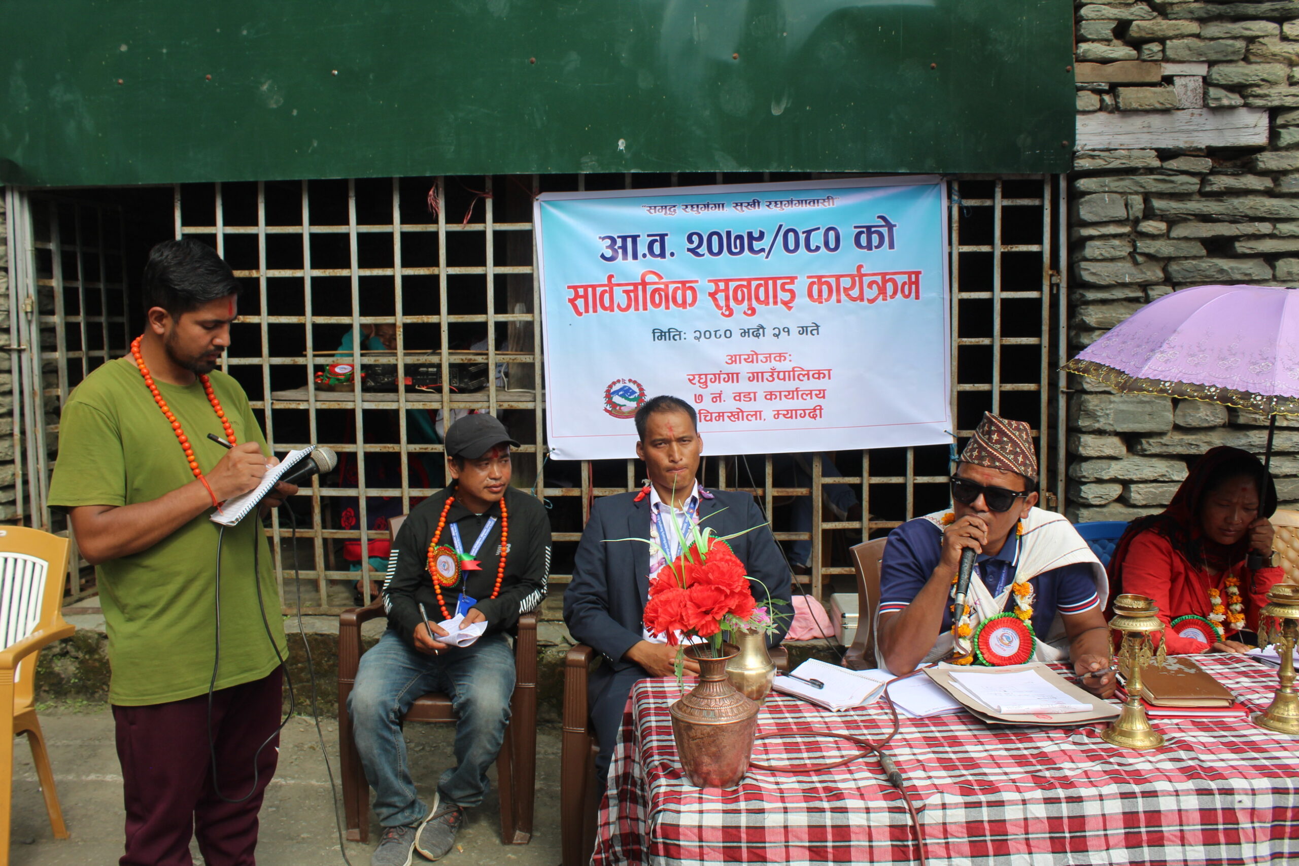 म्याग्दी २२ भदौ । म्याग्दीको रघुगंगा गाउँपालिका–७ चिमखोलामा विहिवार सार्वजनिक सुनुवाई कार्यक्रम सम्पन्न भएको छ । वडा कार्यालयको आयोजनामा भएको उक्त कार्यक्रममा आर्थिक बर्ष २०७९/०८० मा भएका विकास निर्माण, सेवा प्रवाह र सम्पन्न योजना तथा कार्यक्रमहरुको बार्षिक समिक्षा सहित सार्वजनिक सुनुवाई गरिएको हो ।