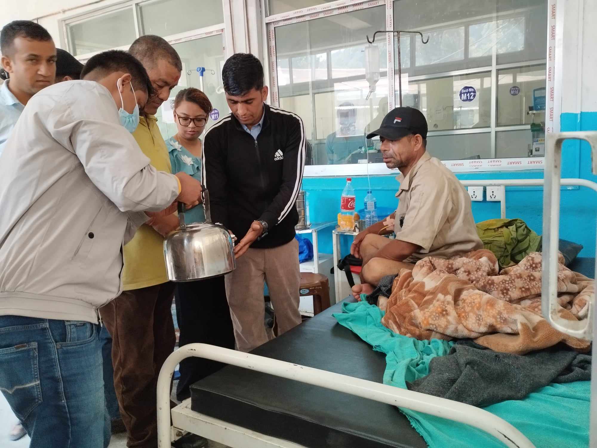 धौलागिरि क्षेत्रमा विभिन्न खाद्यबस्तुको बजारमा विक्रि वितरण गर्ने बजार प्रतिनिधिहरुले बेनी नगरपालिका वडानम्वर ८ का वडाअध्यक्ष उत्तम कर्माचार्य लगायतको उपस्थितमा विरामीको स्वास्थ्य लाभको कामना गर्दै फलफूल वितरण गर्नुभएको थियो ।