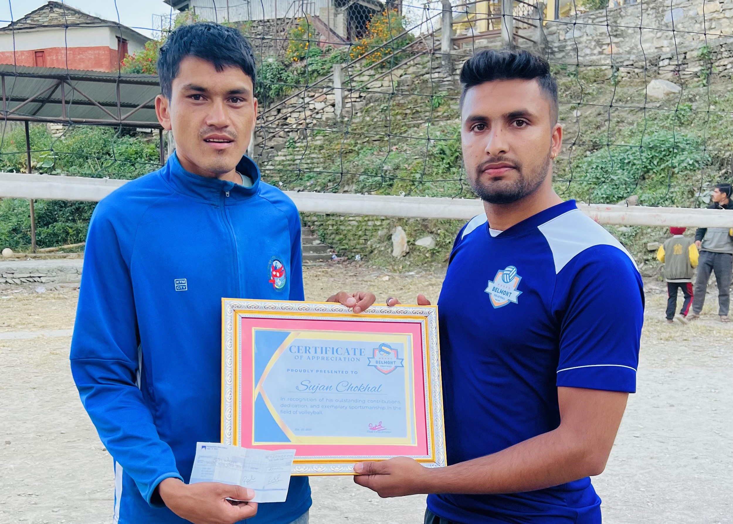 म्याग्दी, १२ कात्तिक । राष्ट्रिय भलिबल खेलाडी सुजन चोखाललाई अमेरिकाको बेलमोन्ट भलिबल क्लवले रु. २५ हजार नगद पुरस्कार सहित सम्मान गरेको छ ।