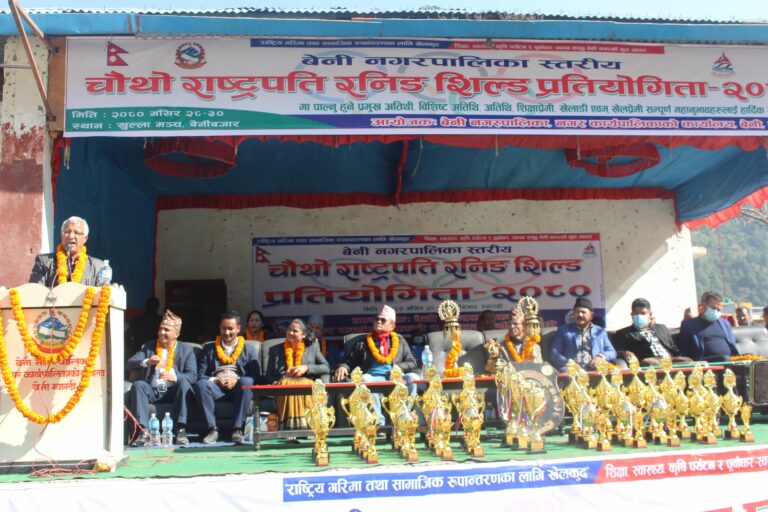 म्याग्दी, २८ मंसिर । बेनी नगरपालिका स्तरीय चौथो राष्ट्रपति रनिङ शिल्ड खेलकुद प्रतियोगिता बेनीस्थित खुल्लामञ्चमा सुरु भएको छ । विद्यालय तहमा रहेका खेल प्रतिभाको पहिचान र प्रवद्र्धन गर्न आयोजित प्रतियोगितामा बेनी नगरपालिकाभित्रका २५ विद्यालयले सहभागीता जनाएका छन् ।