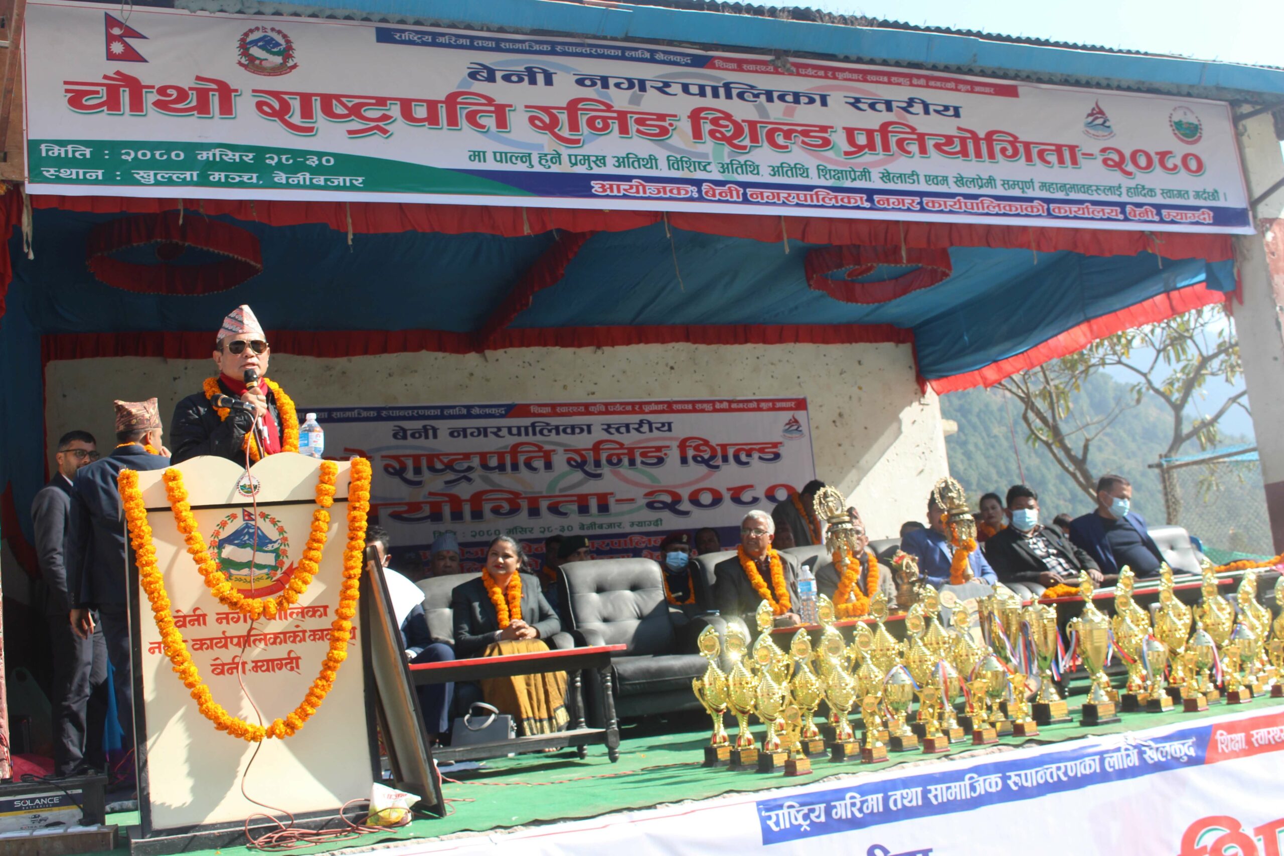म्याग्दी, २८ मंसिर । बेनी नगरपालिका स्तरीय चौथो राष्ट्रपति रनिङ शिल्ड खेलकुद प्रतियोगिता बेनीस्थित खुल्लामञ्चमा सुरु भएको छ । विद्यालय तहमा रहेका खेल प्रतिभाको पहिचान र प्रवद्र्धन गर्न आयोजित प्रतियोगितामा बेनी नगरपालिकाभित्रका २५ विद्यालयले सहभागीता जनाएका छन् ।