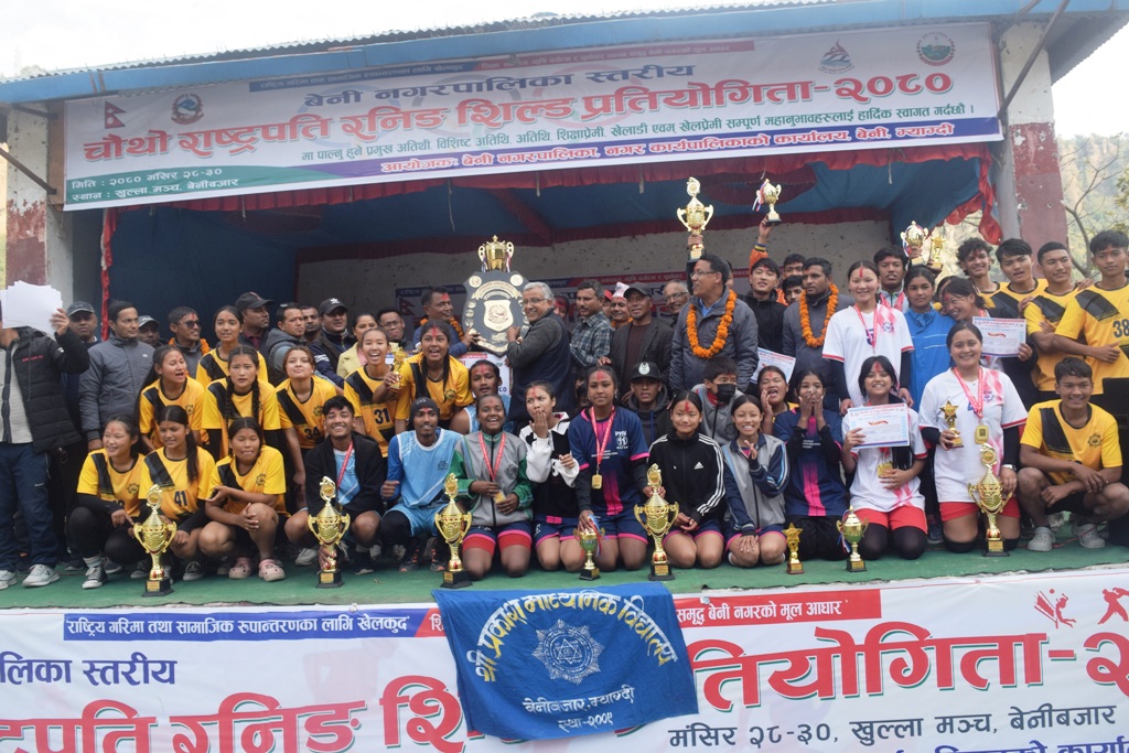 म्याग्दी, ३० मंसिर । सदरमुकाम बेनीमा शनिवार सम्पन्न बेनी नगरपालिका स्तरीय चौथो राष्ट्रपति रनिङ शिल्ड खेलकुद प्रतियोगिताको उपाधि प्रकाश माविले जितेको छ । विभिन्न २५ विद्यालयले सहभागीता जनाएको प्रतियोगितामा २२ स्वर्ण र पाँच रजत पदक सहित प्रकाश माविले उपाधी जितेको हो ।